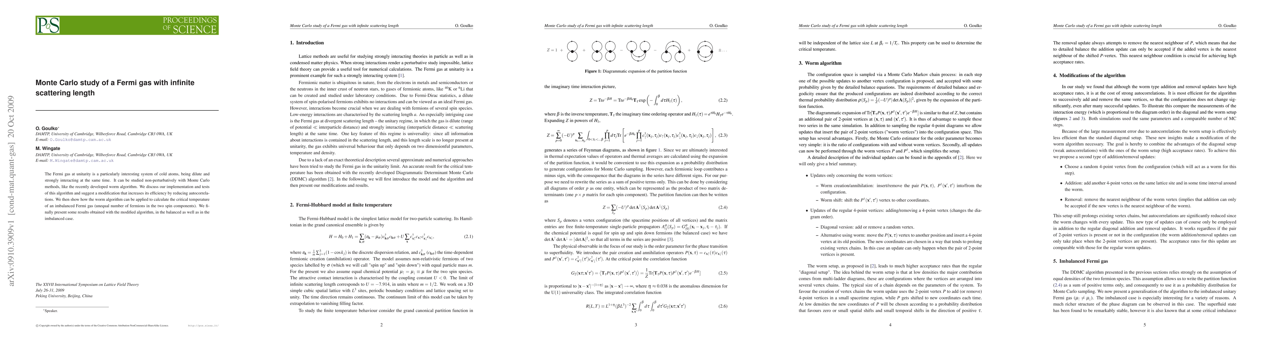 This paper presents a Monte Carlo study using the worm algorithm to investigate a Fermi gas at unitarity, focusing on its implementation and efficiency improvements. The study calculates the critical temperature for both balanced and imbalanced Fermi gases, demonstrating the algorithm's effectiveness.