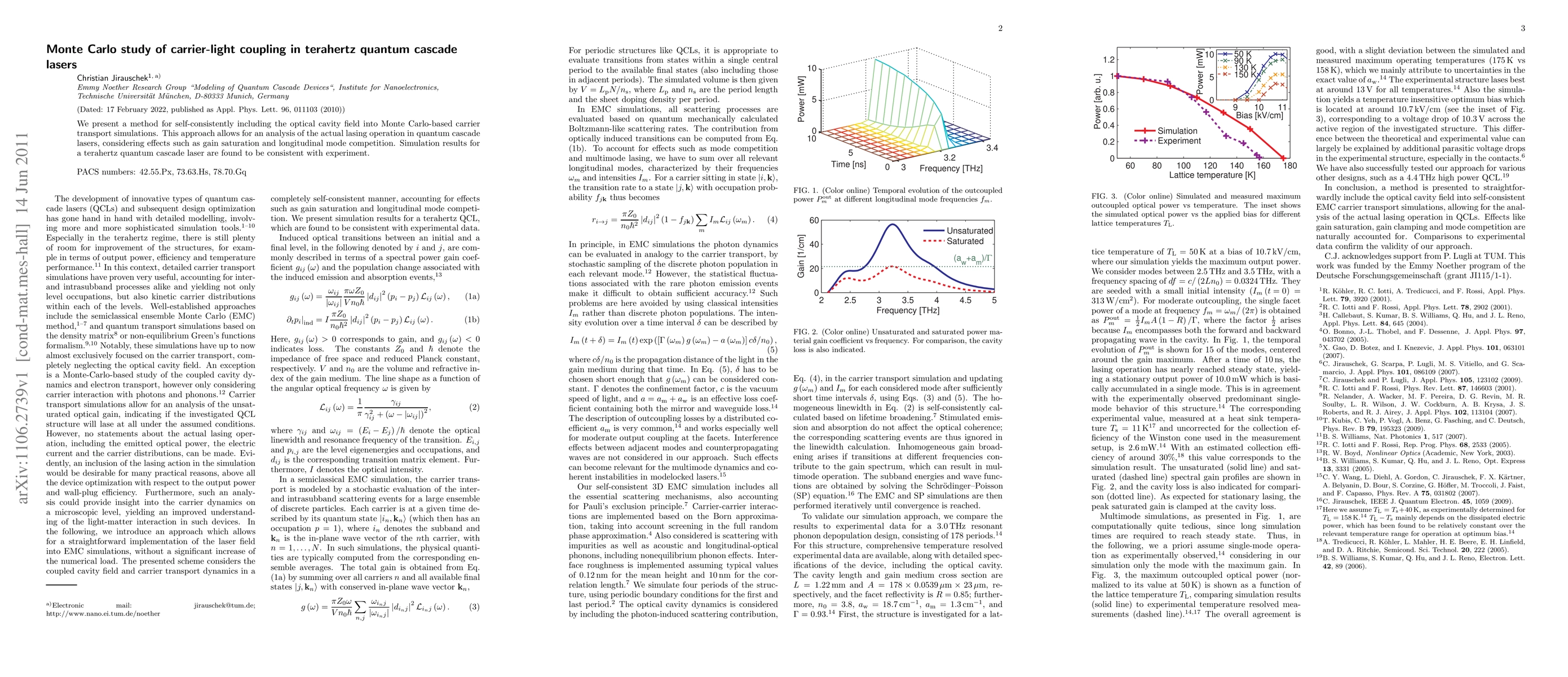 This research introduces a Monte Carlo simulation method incorporating optical cavity fields to analyze terahertz quantum cascade lasers, addressing gain saturation and mode competition, and validates the results against experimental data.