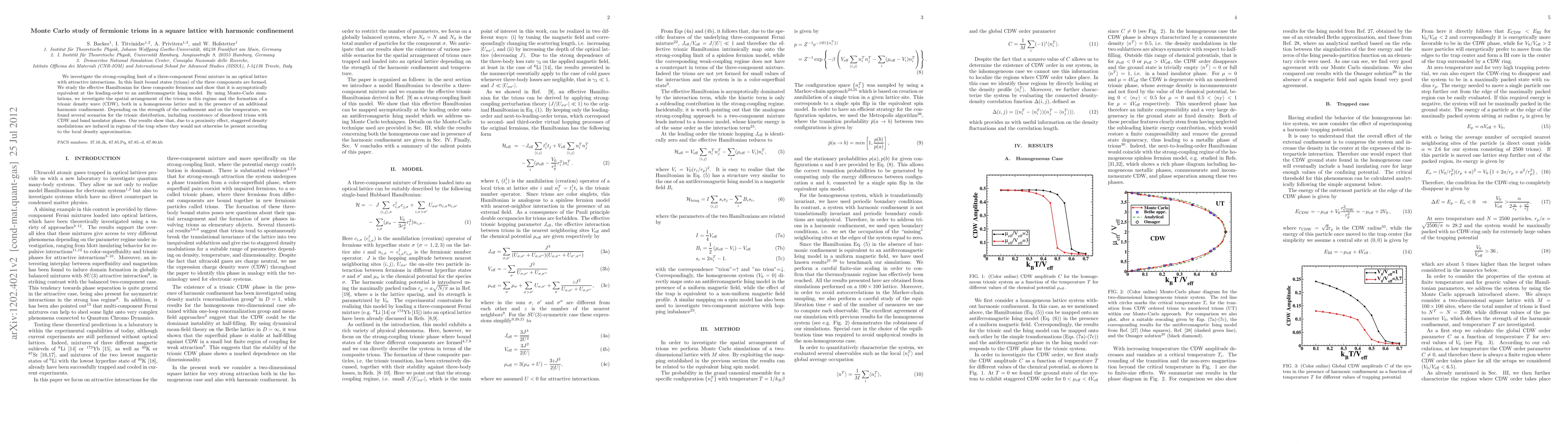 We investigate the strong-coupling limit of a three-component Fermi mixture in an optical lattice with attractive interactions. In this limit bound states (trions) of the three components are formed. We derive an effective Hamiltonian for these composite fermions and show that it is asymptotically equivalent to an antiferromagnetic Ising model. By using Monte-Carlo simulations, we investigate the spatial arrangement of the trions and the formation of a trionic density wave (CDW), both in a homogeneous lattice and in the presence of an additional harmonic confinement. Depending on the strength of the confinement and on the temperature, we found several scenarios for the trionic distribution, including coexistence of disordered trions with CDW and band insulator phases. Our results show that, due to a proximity effect, staggered density modulations are induced in regions of the trap where they would not otherwise be present according to the local density approximation.