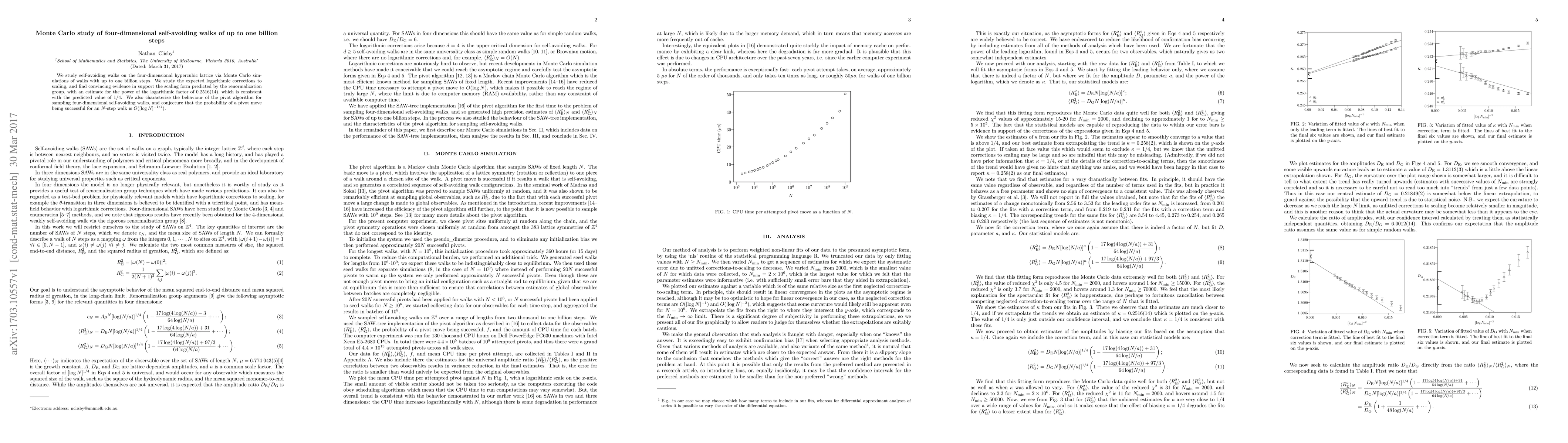 This paper uses Monte Carlo simulations to study four-dimensional self-avoiding walks up to one billion steps, finding evidence supporting the renormalization group's scaling form with a logarithmic correction factor of 0.2516(14). It also analyzes the pivot algorithm's efficiency, suggesting the probability of a successful pivot move scales as $O([ \log N ]^{-1/4})$.