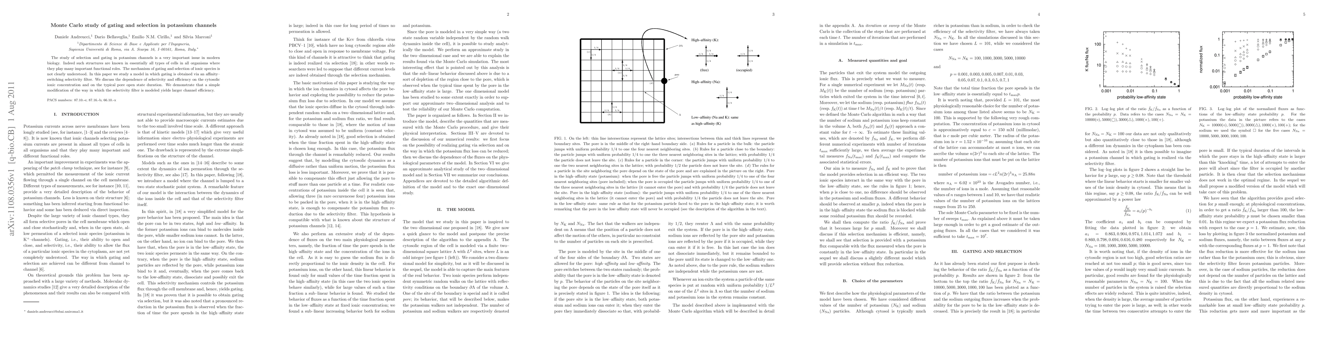 The study of selection and gating in potassium channels is a very important issue in modern biology. Indeed such structures are known in all types of cells in all organisms where they play many important functional roles. The mechanism of gating and selection of ionic species is not clearly understood. In this paper we study a model in which gating is obtained via an affinity-switching selectivity filter. We discuss the dependence of selectivity and efficiency on the cytosolic ionic concentration and on the typical pore open state duration. We demonstrate that a simple modification of the way in which the selectivity filter is modeled yields larger channel efficiency.