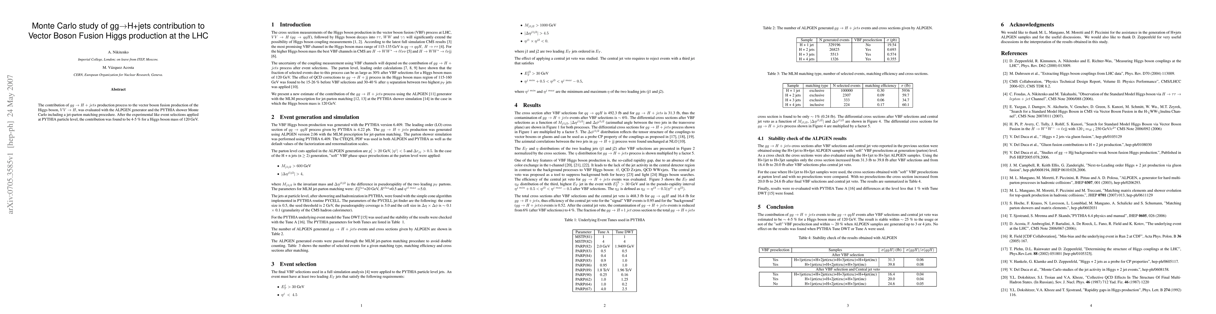 Summary: This study evaluates the gg->H+jets process's contribution to vector boson fusion Higgs production at the LHC using ALPGEN and PYTHIA Monte Carlo simulations, finding it accounts for 4-5% of the total VV->H production for a Higgs boson mass of 120 GeV.