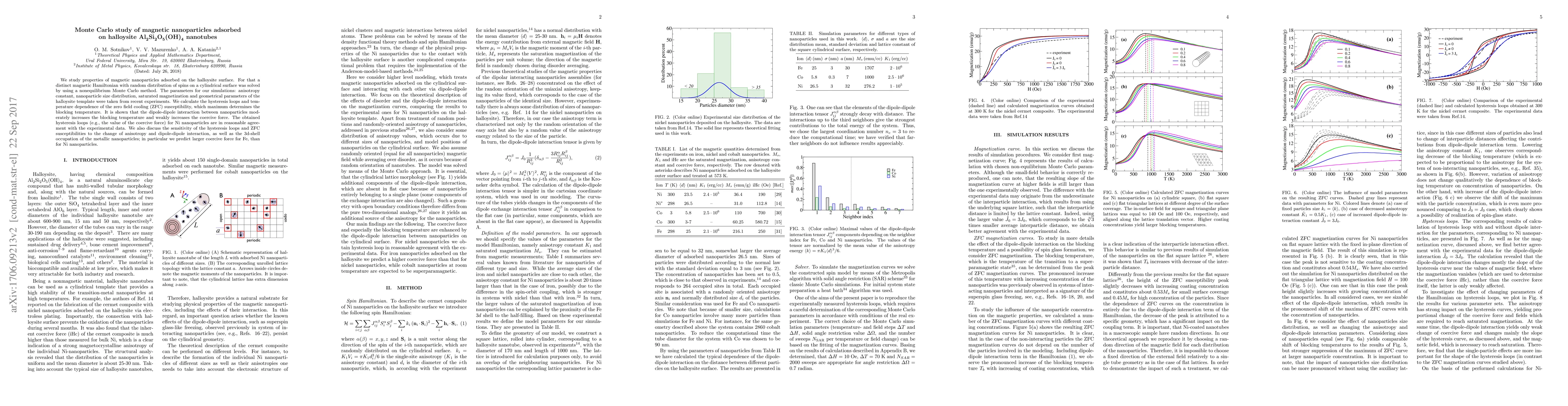 We study properties of magnetic nanoparticles adsorbed on the halloysite surface. For that a distinct magnetic Hamiltonian with random distribution of spins on a cylindrical surface was solved by using a nonequilibrium Monte Carlo method. The parameters for our simulations: anisotropy constant, nanoparticle size distribution, saturated magnetization and geometrical parameters of the halloysite template were taken from recent experiments. We calculate the hysteresis loops and temperature dependence of the zero field cooling (ZFC) susceptibility, which maximum determines the blocking temperature. It is shown that the dipole-dipole interaction between nanoparticles moderately increases the blocking temperature and weakly increases the coercive force. The obtained hysteresis loops (e.g., the value of the coercive force) for Ni nanoparticles are in reasonable agreement with the experimental data. We also discuss the sensitivity of the hysteresis loops and ZFC susceptibilities to the change of anisotropy and dipole-dipole interaction, as well as the 3d-shell occupation of the metallic nanoparticles; in particular we predict larger coercive force for Fe, than for Ni nanoparticles.