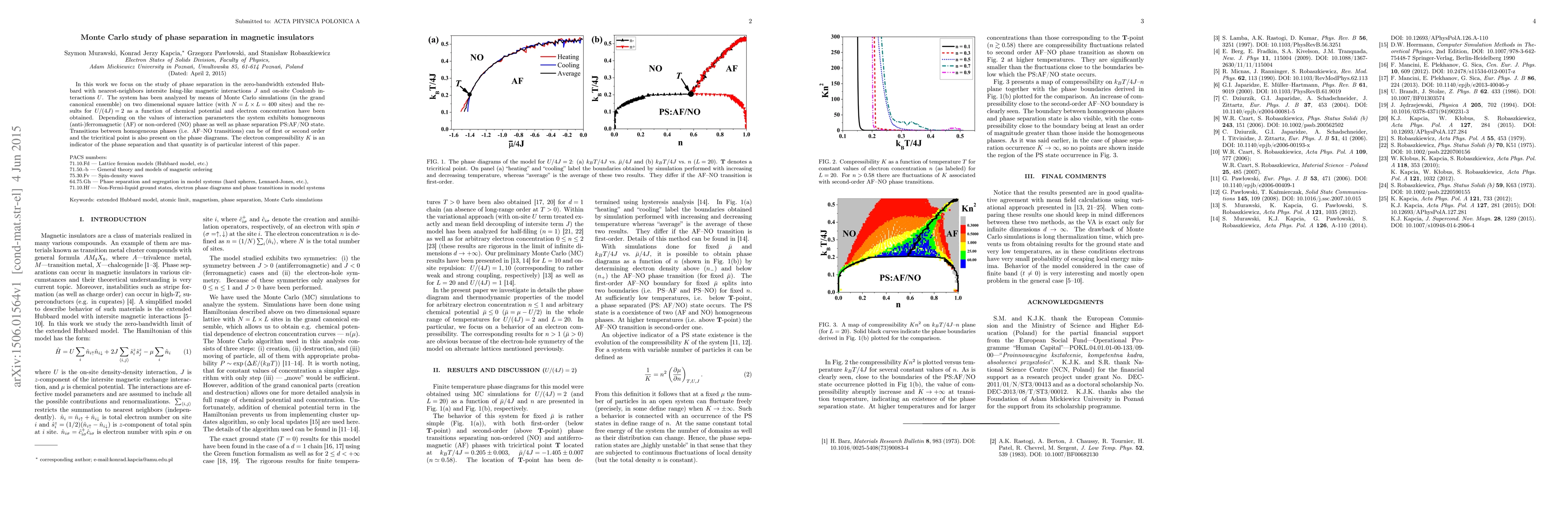 This paper uses Monte Carlo simulations to study phase separation in magnetic insulators with extended Hubbard models, revealing transitions between homogeneous and phase-separated states, and identifying the tricritical point. The electron compressibility $K$ is highlighted as a key indicator of the phase separation phenomena.