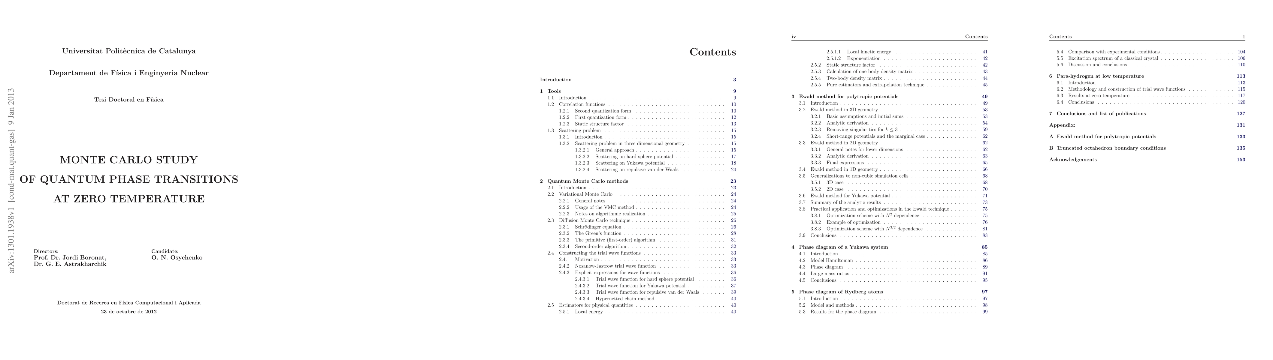 In this Ph.D. thesis quantum Monte Carlo methods are applied to investigate the properties of a number of ultracold quantum systems. In Chapter 1 we discuss the analytical approaches and approximations used in the subsequent Chapters; also we describe the general concepts of the two-particle scattering problem as a tool to construct Jastrow terms in trial wave functions. Chapter 2 explains in details the Quantum Monte Carlo methods employed in our calculations from the theoretical and practical points of view. In Chapter 3 we explain the Ewald summation technique, applied to a power-law 1/|r|k interaction potential, and a generic approach to obtain the Ewald terms. The obtained expressions of this analytic work are implemented into simulations of different physically relevant systems (Rydberg atoms and Yukawa particles). Chapter 5 is devoted to the modelling of a system, governed by the model potential between Rydberg atoms $1/r^6$. The phase diagram of the system is obtained for a relevant range of densities and temperatures, combining quantum simulations at low temperature and classical treatment at higher temperature. A special attention is paid to the classical description of this system, composed of Rydberg atoms, and its comparison to the quantum system. In Chapter 4 we present the simulation of a system with the Yukawa interaction potential. The following Chapter 6 presents the results of the Quantum Monte Carlo simulations of molecular para-hydrogen at zero and finite temperatures, performed in our Group. Conclusions are drawn in Chapter 7.