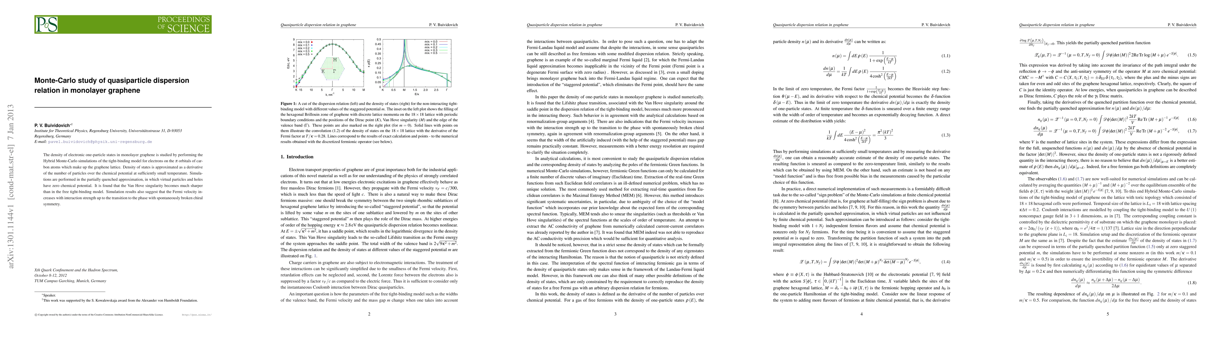 This study uses Hybrid Monte-Carlo simulations to investigate the quasiparticle dispersion relation in monolayer graphene, revealing a sharper Van Hove singularity and an increase in Fermi velocity with interaction strength, leading to a phase with spontaneously broken chiral symmetry.