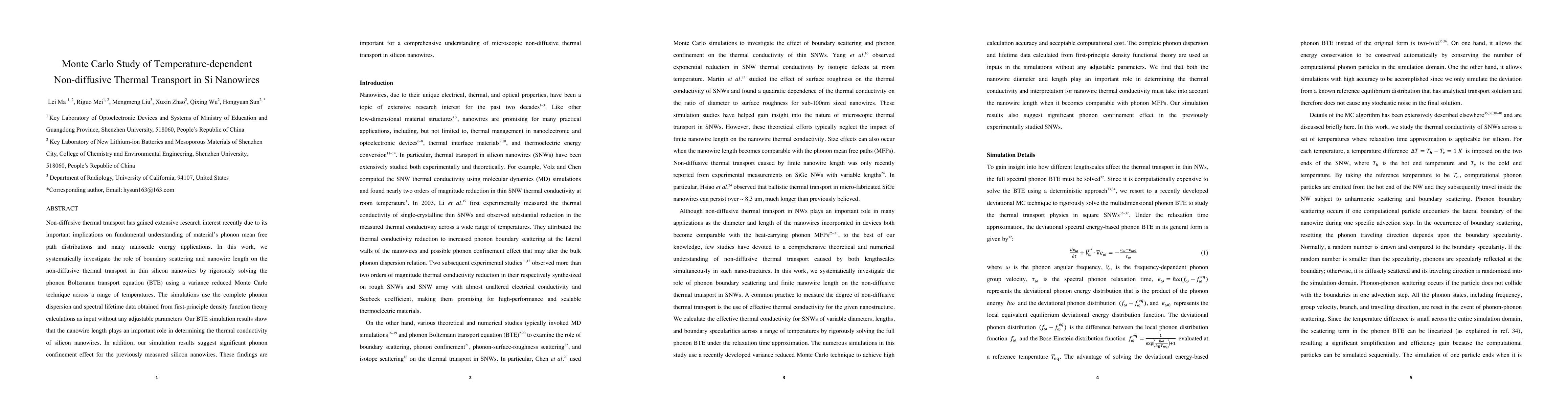 This paper uses Monte Carlo simulations to study non-diffusive thermal transport in silicon nanowires, focusing on the effects of boundary scattering and nanowire length across various temperatures. The results highlight the significant influence of nanowire length on thermal conductivity and suggest a notable phonon confinement effect.