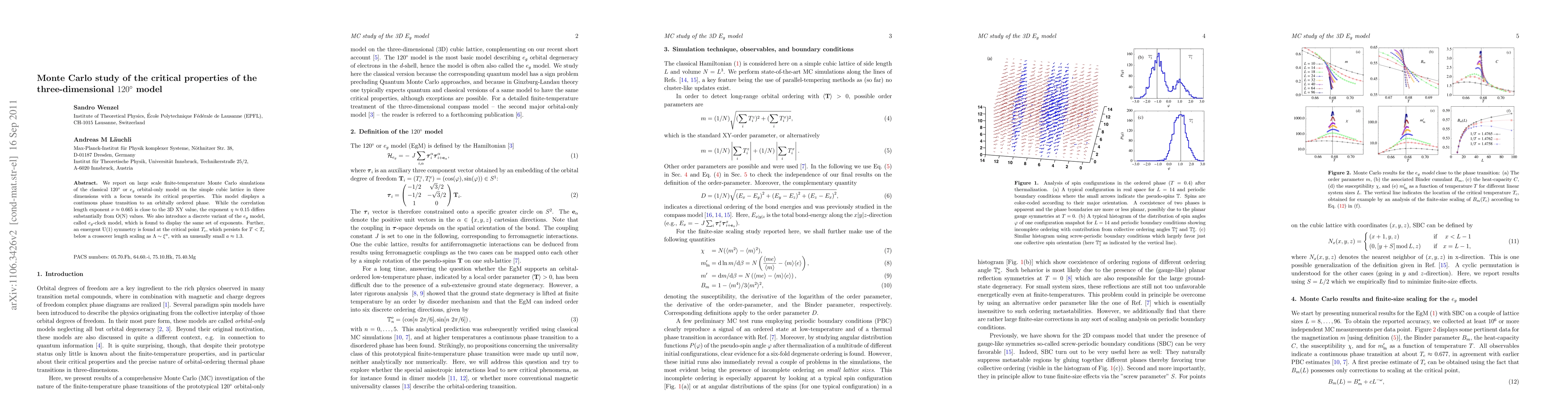 Researchers studied a 120-degree model in three dimensions, finding a continuous phase transition to an orbitally ordered phase with unusual exponents for correlation length and scale, as well as emergent U(1) symmetry at the critical point.