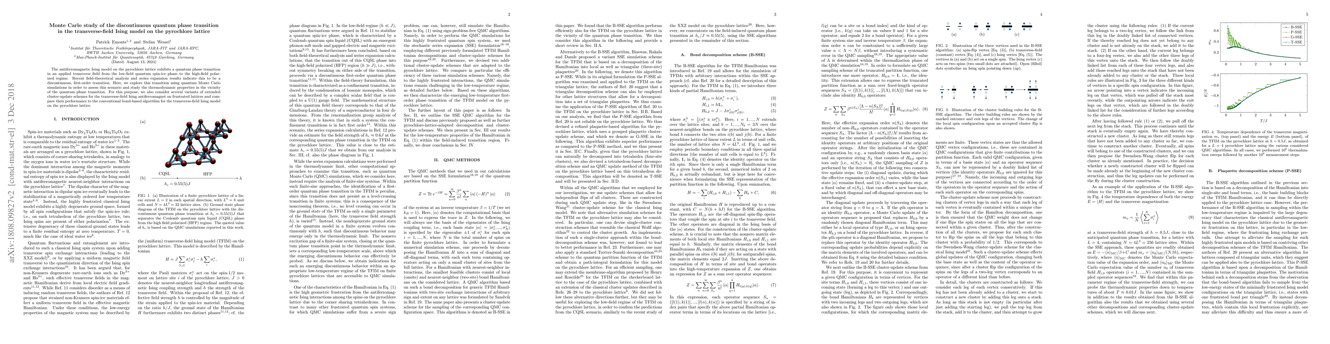 This paper uses quantum Monte Carlo simulations to investigate the discontinuous quantum phase transition in the transverse-field Ising model on the pyrochlore lattice, comparing various cluster-update schemes to determine the best method for studying this first-order transition and its thermodynamic properties.