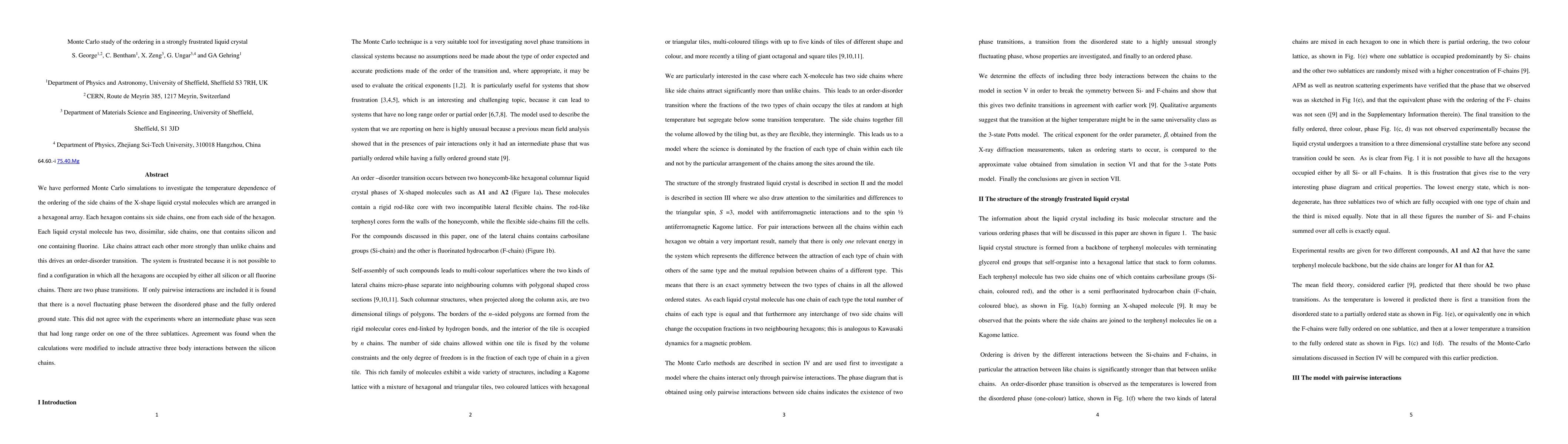 We have performed Monte Carlo simulations to investigate the temperature dependence of the ordering of the side chains of the X-shape liquid crystal molecules which are arranged in a hexagonal array. Each hexagon contains six side chains, one from each side of the hexagon. Each liquid crystal molecule has two, dissimilar, side chains, one that contains silicon and one containing fluorine. Like chains attract each other more strongly than unlike chains and this drives an order-disorder transition. The system is frustrated because it is not possible to find a configuration in which all the hexagons are occupied by either all silicon or all fluorine chains. There are two phase transitions. If only pairwise interactions are included it is found that there is a novel fluctuating phase between the disordered phase and the fully ordered ground state. This did not agree with the experiments where an intermediate phase was seen that had long range order on one of the three sublattices. Agreement was found when the calculations were modified to include attractive three body interactions between the silicon chains.