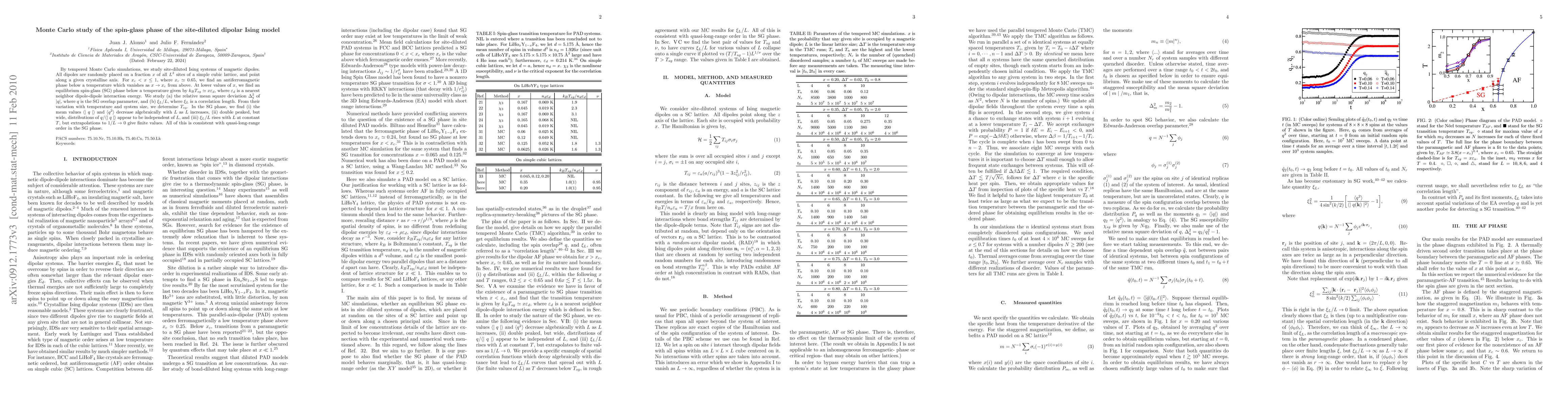 Researchers used Monte Carlo simulations to study a type of material called a spin-glass phase in site-diluted dipolar Ising models. They found that the temperature at which this phase occurs decreases as the concentration of magnetic dipoles increases.
