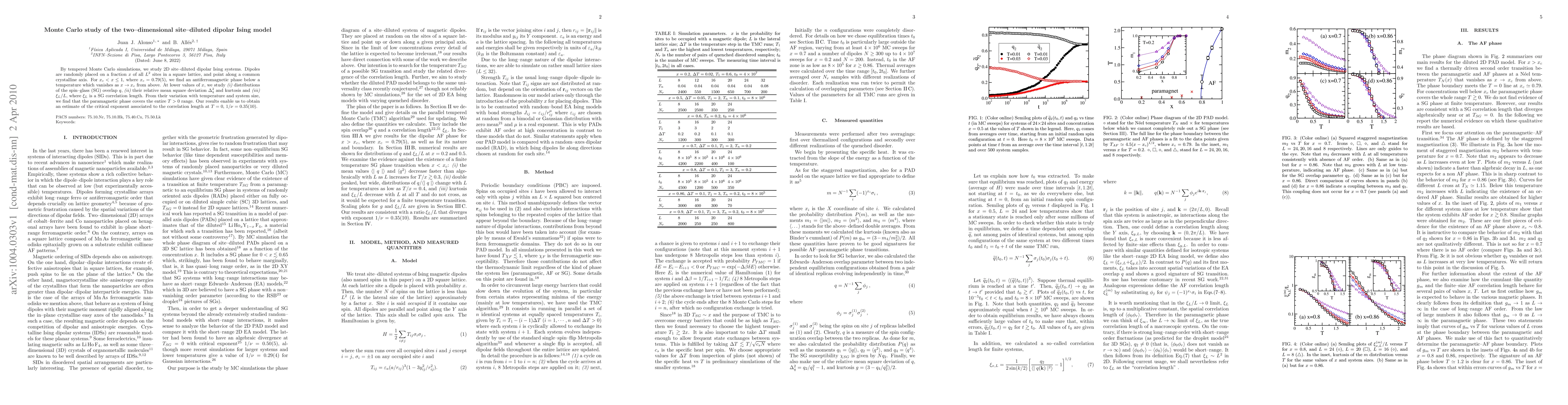 Researchers studied a 2D model of magnetic interactions with randomly placed dipoles in a square lattice, finding an antiferromagnetic phase that vanishes as the proportion of dipoles increases. The study provides insight into the critical behavior of spin-glass systems and estimates the correlation length exponent at T=0.