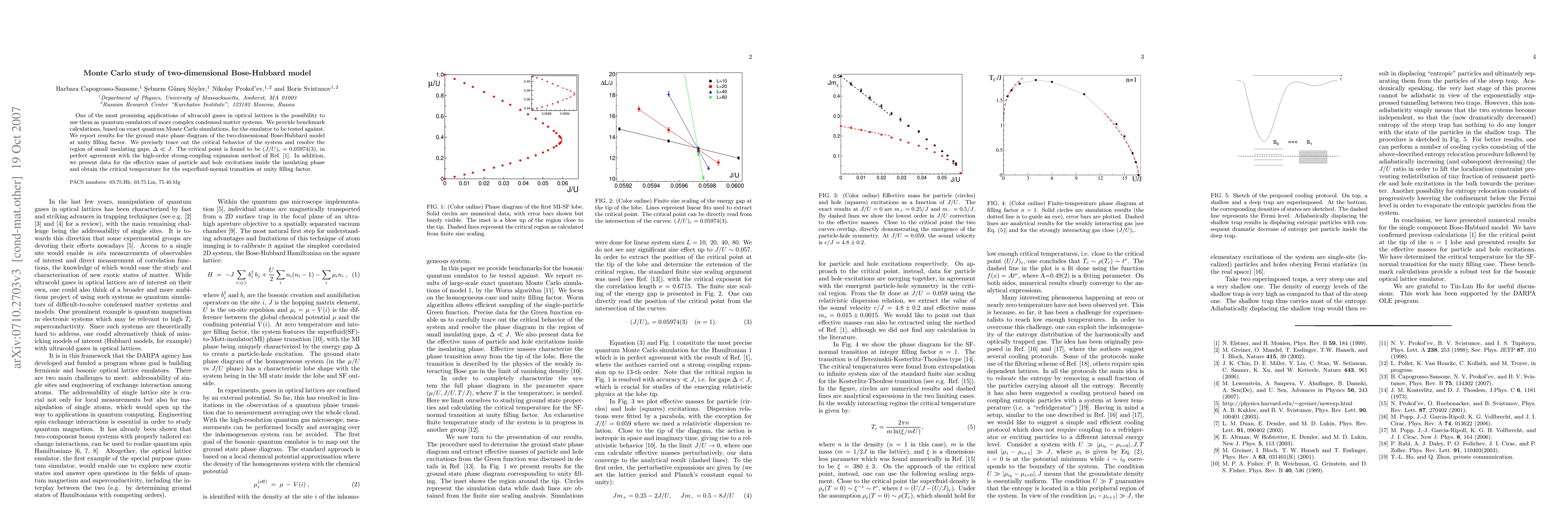 This paper presents Monte Carlo simulations of the two-dimensional Bose-Hubbard model, providing benchmark data for quantum emulators. It reports the critical point (J/U)_c=0.05974(3) and details the insulating phase's effective mass and critical temperature for the superfluid-normal transition.