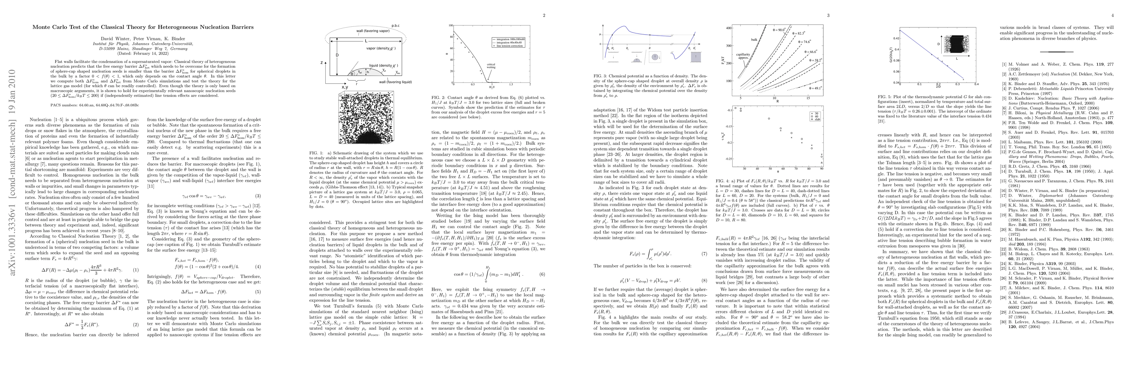 This paper uses Monte Carlo simulations to test the classical theory of heterogeneous nucleation, finding that the predicted reduction in free energy barriers for nucleation seeds on flat walls holds true for nanoscopic scales, provided line tension effects are accounted for. The study confirms the theory's applicability to experimentally relevant conditions.