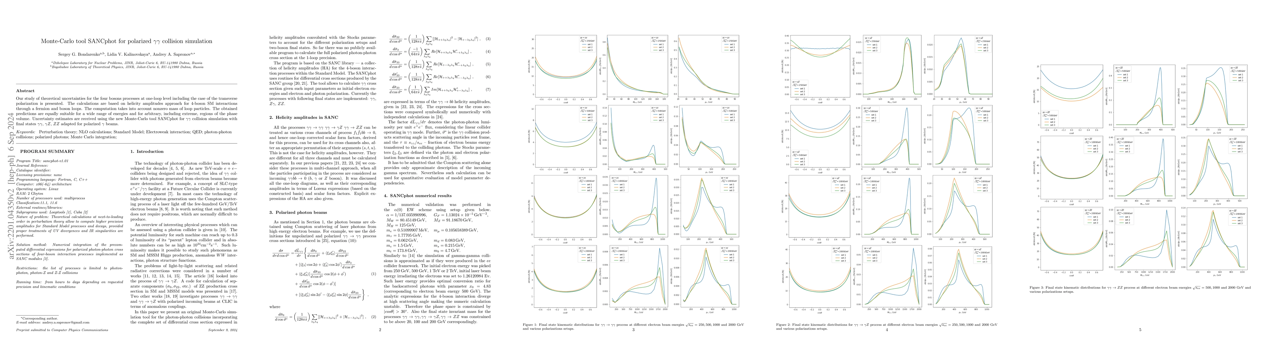 This paper introduces SANCphot, a Monte-Carlo tool for simulating polarized $\gamma\gamma$ collisions at one-loop level, focusing on four-boson processes. The study estimates theoretical uncertainties using helicity amplitudes for fermion and boson loops, considering nonzero mass effects, and is applicable across various energy ranges and polarization states.
