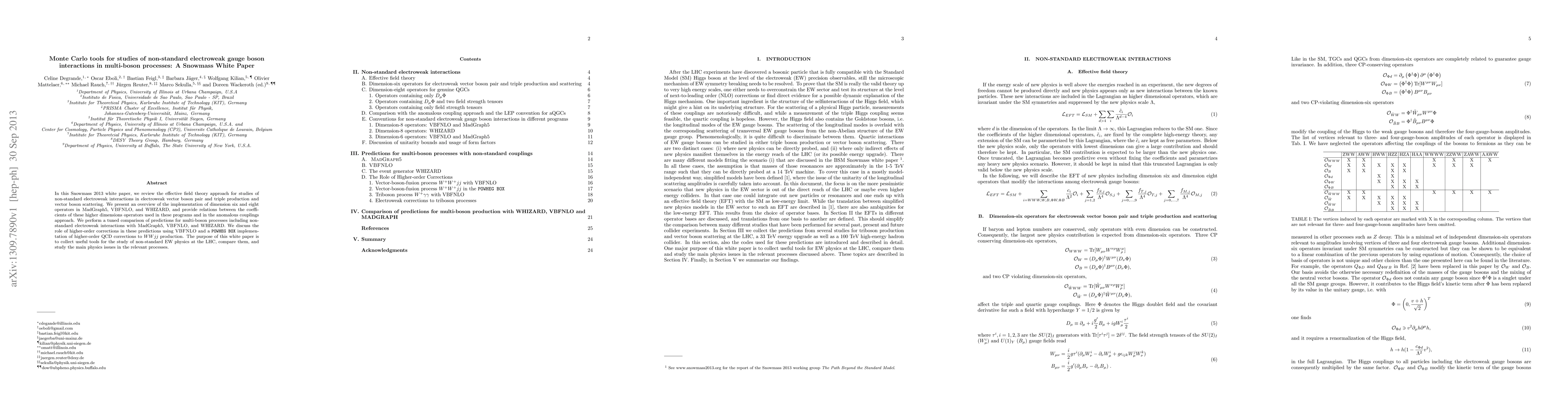 In this Snowmass 2013 white paper, we review the effective field theory approach for studies of non-standard electroweak interactions in electroweak vector boson pair and triple production and vector boson scattering. We present an overview of the implementation of dimension six and eight operators in MadGraph5, VBFNLO, and WHIZARD, and provide relations between the coefficients of these higher dimensions operators used in these programs and in the anomalous couplings approach. We perform a tuned comparison of predictions for multi-boson processes including non-standard electroweak interactions with MadGraph5, VBFNLO, and WHIZARD. We discuss the role of higher-order corrections in these predictions using VBFNLO and a POWHEG BOX implementation of higher-order QCD corrections to WWjj production. The purpose of this white paper is to collect useful tools for the study of non-standard EW physics at the LHC, compare them, and study the main physics issues in the relevant processes.