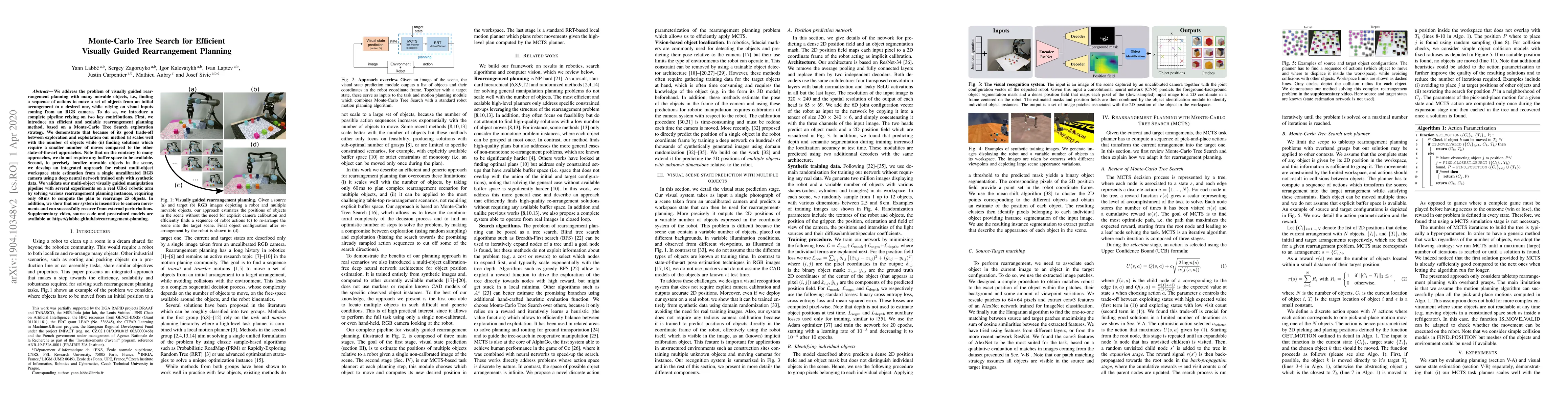 This paper presents a scalable Monte-Carlo Tree Search method for visually guided rearrangement planning, achieving efficient solutions with fewer moves compared to existing methods. It also introduces a deep neural network for robust multi-object localization from a single uncalibrated RGB camera, validated through experiments on a UR-5 robotic arm.