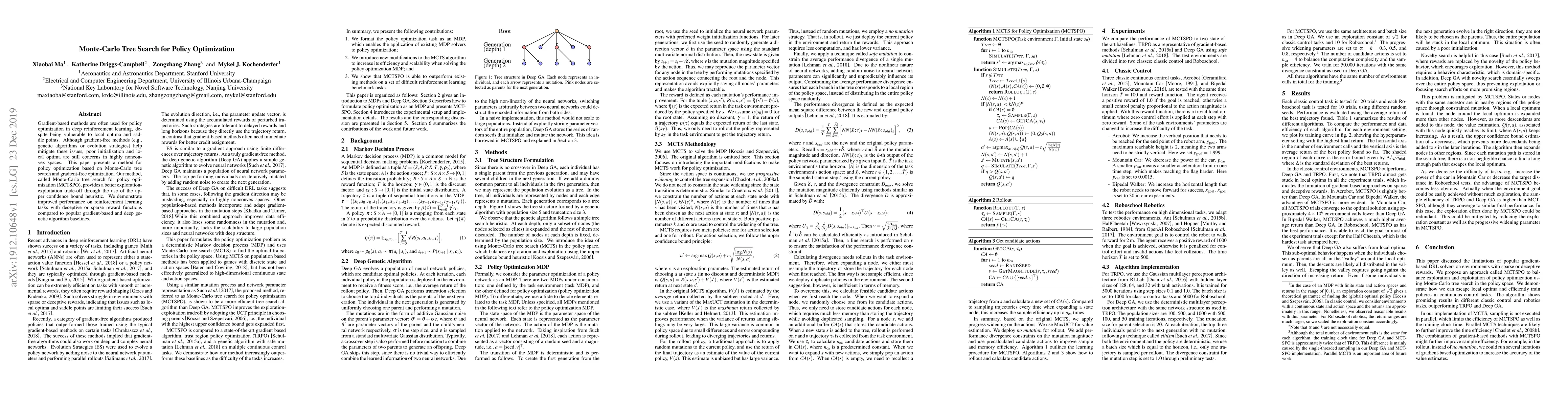 This paper introduces Monte-Carlo tree search for policy optimization (MCTSPO), a gradient-free method that combines Monte-Carlo tree search with gradient-free optimization for deep reinforcement learning. The method shows improved performance on tasks with deceptive or sparse rewards, outperforming gradient-based and deep genetic algorithm baselines.