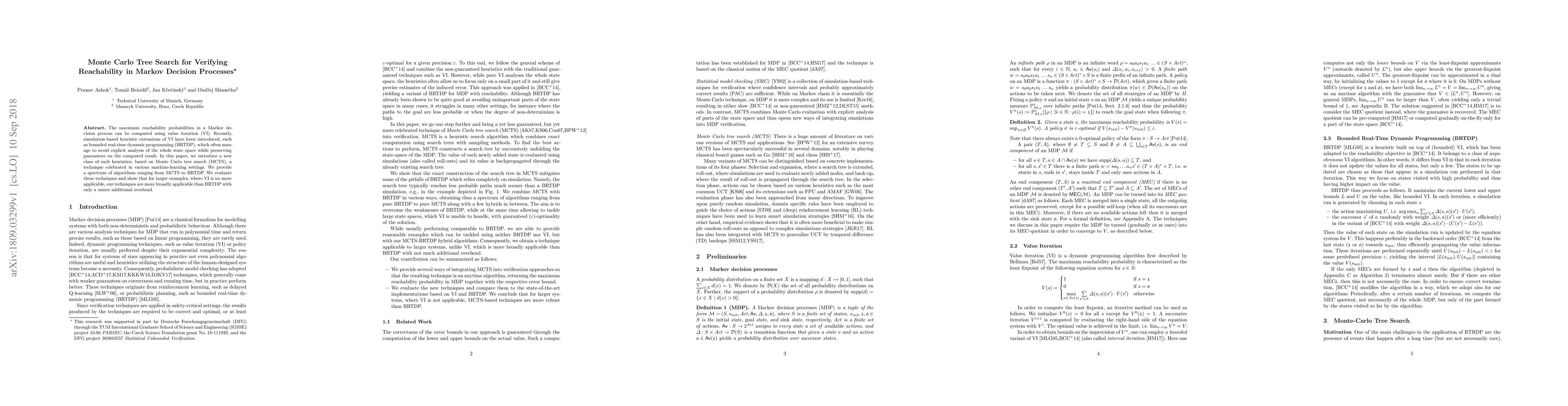 This paper introduces Monte Carlo Tree Search (MCTS) for computing maximum reachability probabilities in Markov decision processes, offering a spectrum of algorithms from MCTS to BRTDP. The results show that MCTS-based methods are more broadly applicable than BRTDP for larger examples, with only a minor additional overhead.