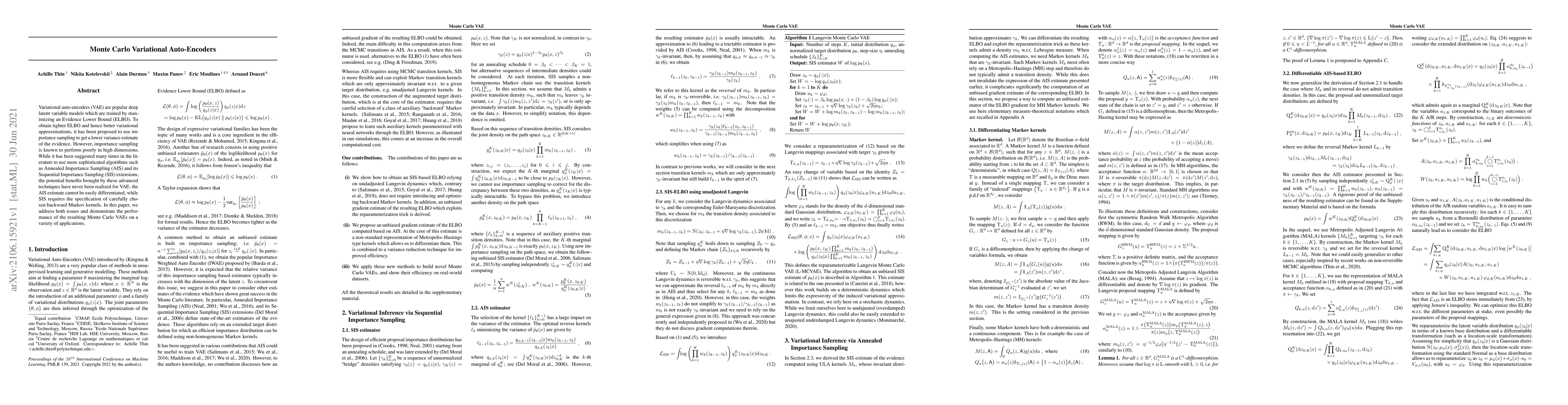This paper proposes Monte Carlo Variational Auto-Encoders (MC VAEs) to improve the training of VAEs by using advanced Monte Carlo techniques to obtain lower variance estimates of the Evidence Lower Bound (ELBO), addressing the limitations of traditional importance sampling in high dimensions. The results show improved performance across various applications.