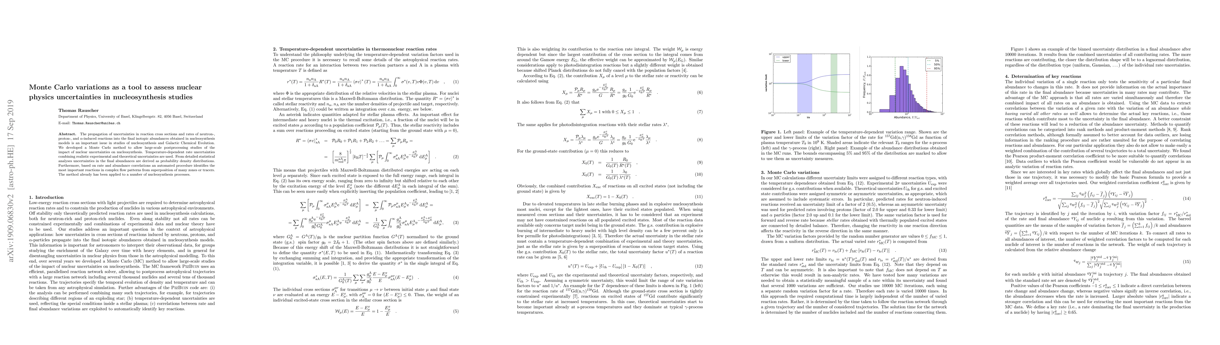 This paper develops a Monte Carlo method to assess uncertainties in nuclear reaction cross sections and rates, propagating these uncertainties into nucleosynthesis models to evaluate their impact on isotopic abundances. The method identifies key reactions influencing nucleosynthesis and has been applied to various nucleosynthesis processes.