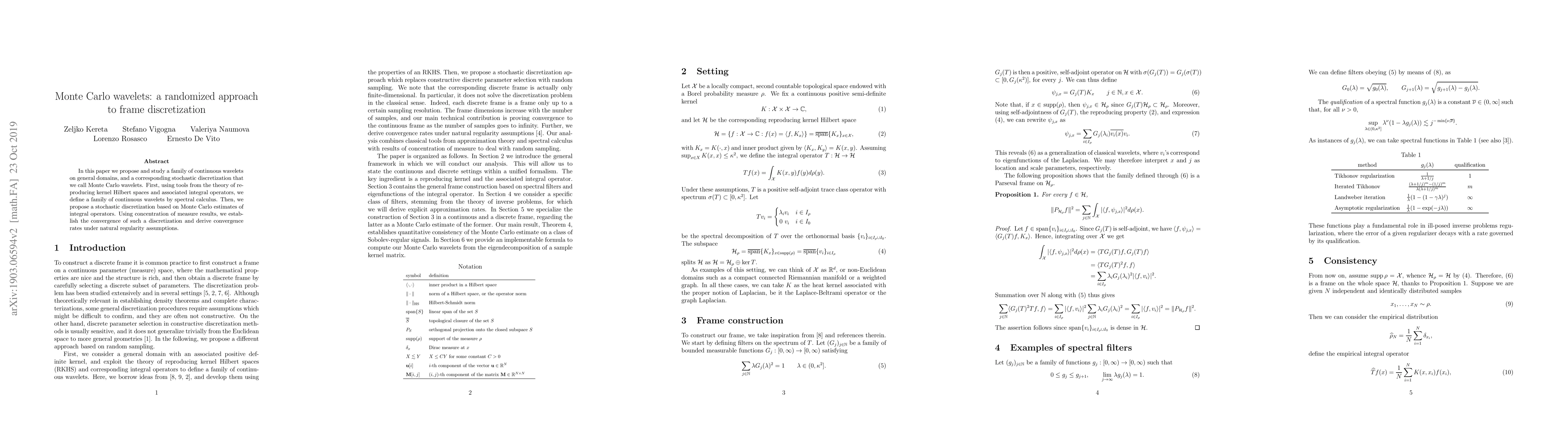 Researchers propose a new method called Monte Carlo wavelets for approximating continuous wavelet functions on general domains. The method uses random sampling to estimate the integral operators associated with wavelet functions, allowing for efficient discretization and convergence under certain regularity assumptions.