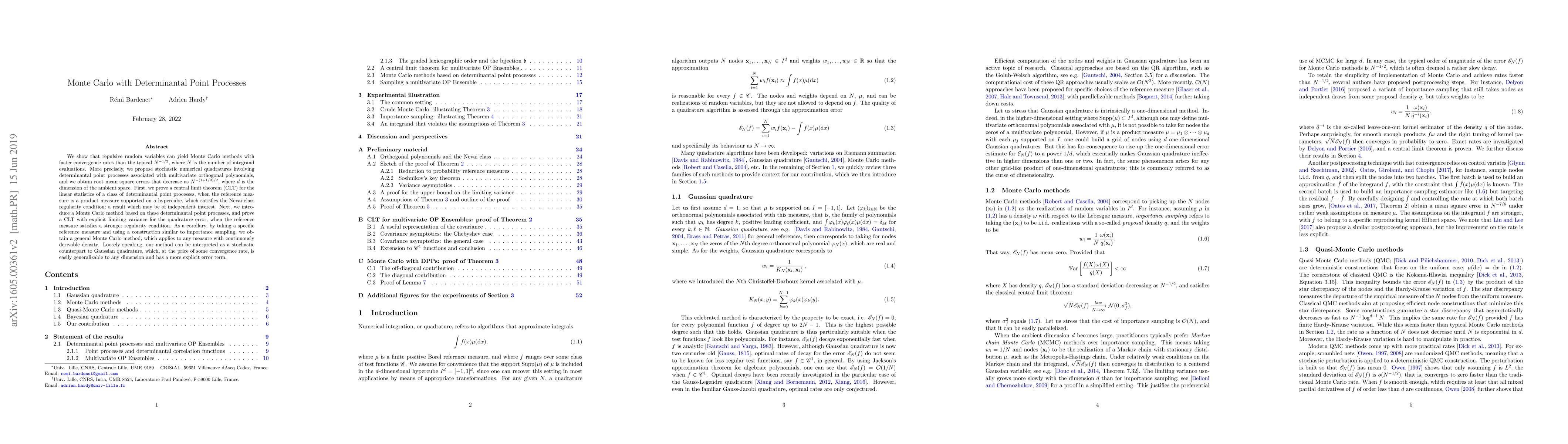 This paper proposes a Monte Carlo method using determinantal point processes that achieves faster convergence rates than traditional methods, with root mean square errors decreasing as $N^{-(1+1/d)/2}$. It also proves a central limit theorem for the linear statistics of these processes and introduces a generalizable Monte Carlo method applicable to any measure with continuously derivable density.