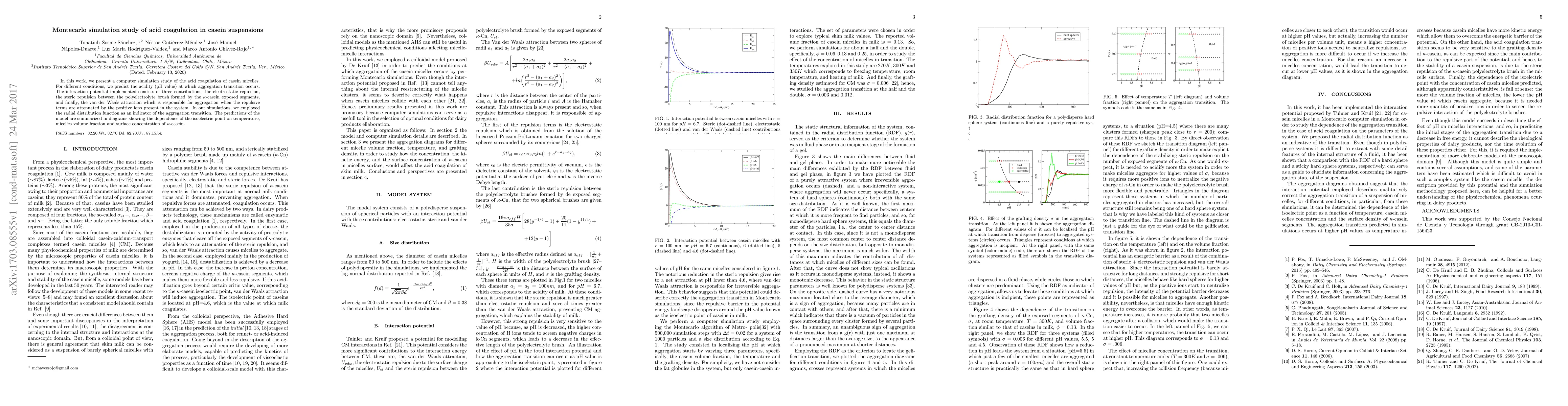 In this work, we present a computer simulation study of the acid coagulation of casein micelles. For different conditions, we predict the acidity (pH value) at which aggregation transition occurs. The interaction potential implemented consists of three contributions, the electrostatic repulsion, the steric repulsion between the polyelectrolyte brush formed by the $\kappa$-casein exposed segments, and finally, the van der Waals attraction which is responsible for aggregation when the repulsive terms are attenuated by the positive ions present in the system. In our simulations, we employed the radial distribution function as an indicator of the aggregation transition. The predictions of the model, are summarized in diagrams showing the dependence of the isoelectric point on temperature, micelles volume fraction and surface concentration of $\kappa$-casein.