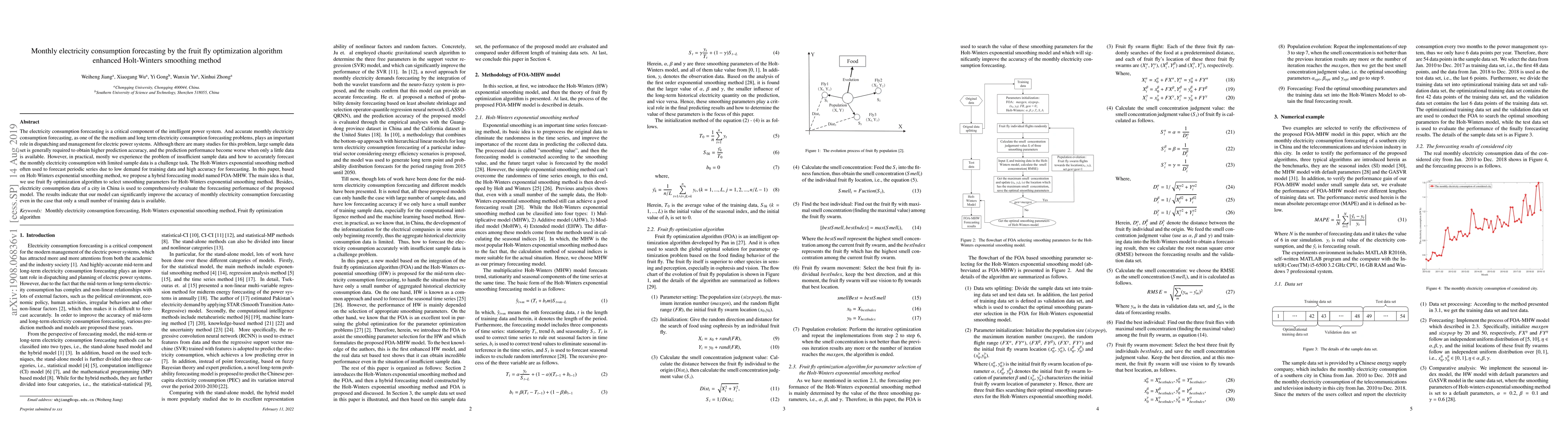 This paper proposes a hybrid forecasting model, FOA-MHW, which combines the fruit fly optimization algorithm with the Holt-Winters exponential smoothing method to enhance monthly electricity consumption forecasting, especially with limited sample data. The model demonstrates improved accuracy in forecasting even when training data is scarce.
