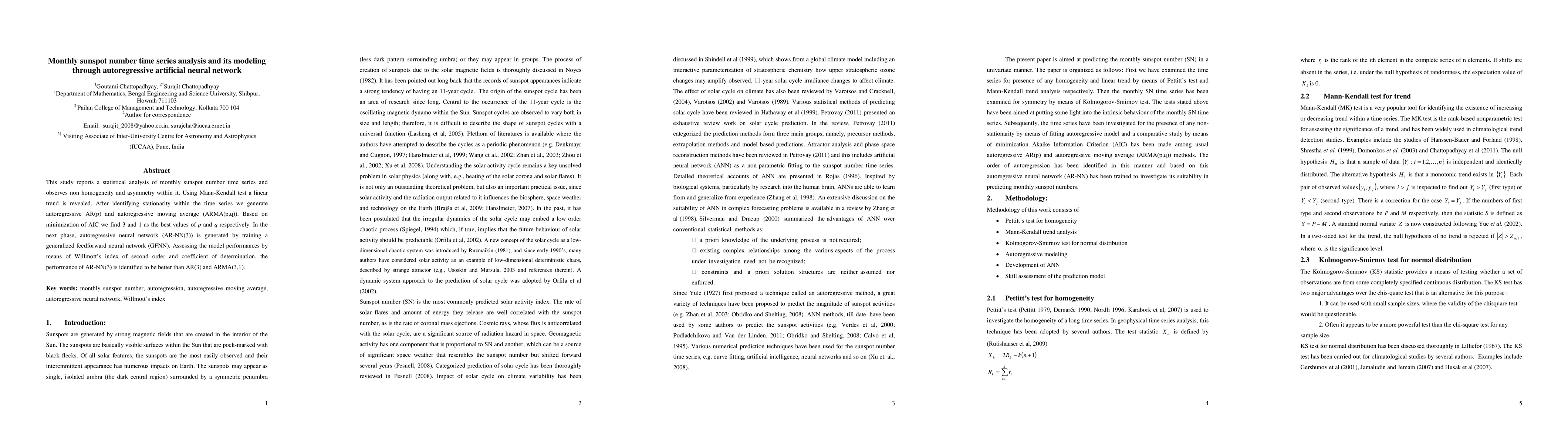 This study reports a statistical analysis of monthly sunspot number time series and observes non homogeneity and asymmetry within it. Using Mann-Kendall test a linear trend is revealed. After identifying stationarity within the time series we generate autoregressive AR(p) and autoregressive moving average (ARMA(p,q)). Based on minimization of AIC we find 3 and 1 as the best values of p and q respectively. In the next phase, autoregressive neural network (AR-NN(3)) is generated by training a generalized feedforward neural network (GFNN). Assessing the model performances by means of Willmott's index of second order and coefficient of determination, the performance of AR-NN(3) is identified to be better than AR(3) and ARMA(3,1).