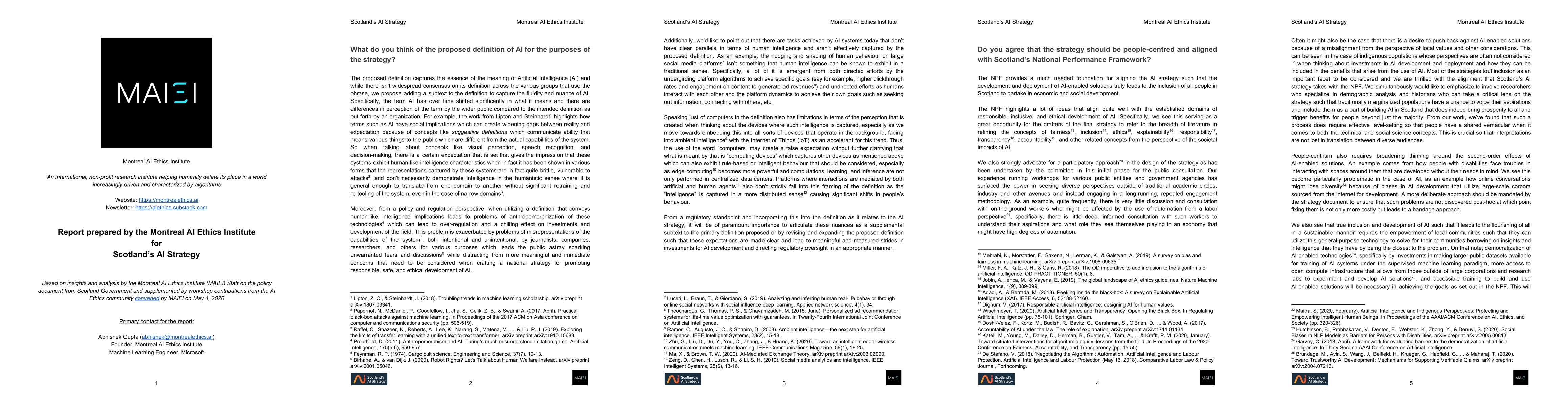 The Montreal AI Ethics Institute (MAIEI) critically reviewed Scotland's AI strategy documents, emphasizing the need for a people-centered approach, ethical AI development, and transparent success metrics. MAIEI also advocates for inclusion of biometric data considerations and guidelines for responsible deep learning system development.