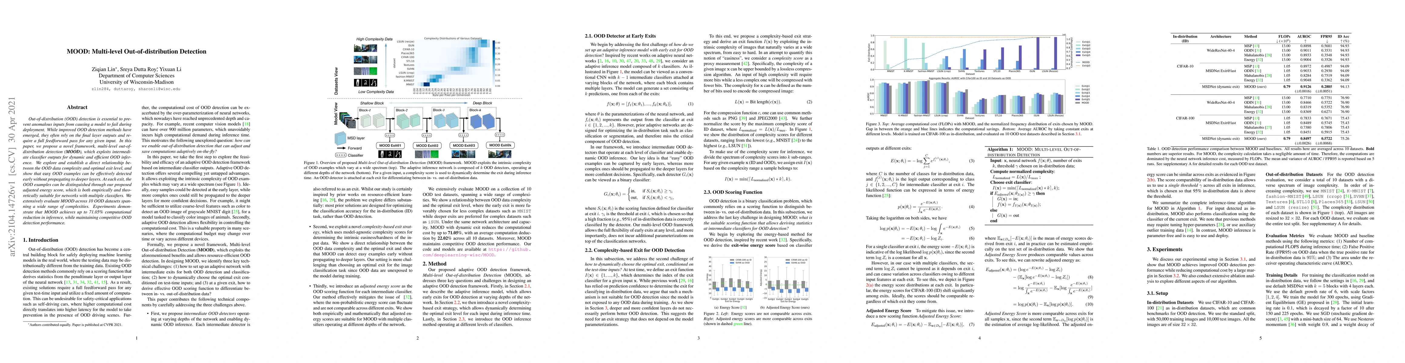 The MOOD framework proposes a novel multi-level out-of-distribution detection method that leverages intermediate classifier outputs to efficiently detect anomalies early, reducing computational costs by up to 71.05% while maintaining strong detection performance across diverse datasets.
