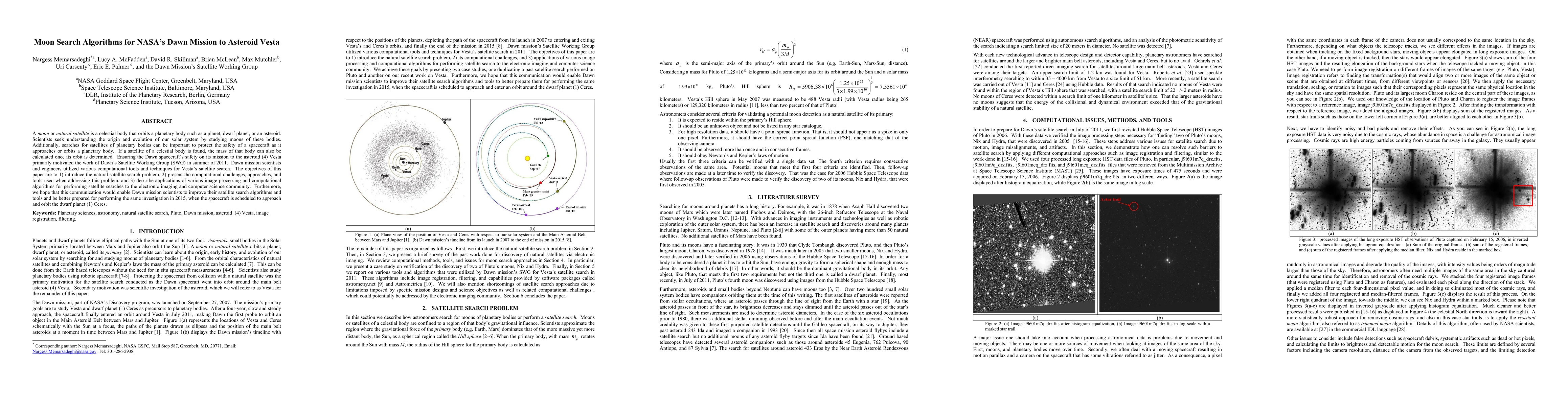 A moon or natural satellite is a celestial body that orbits a planetary body such as a planet, dwarf planet, or an asteroid. Scientists seek understanding the origin and evolution of our solar system by studying moons of these bodies. Additionally, searches for satellites of planetary bodies can be important to protect the safety of a spacecraft as it approaches or orbits a planetary body. If a satellite of a celestial body is found, the mass of that body can also be calculated once its orbit is determined. Ensuring the Dawn spacecraft's safety on its mission to the asteroid (4) Vesta primarily motivated the work of Dawn's Satellite Working Group (SWG) in summer of 2011. Dawn mission scientists and engineers utilized various computational tools and techniques for Vesta's satellite search. The objectives of this paper are to 1) introduce the natural satellite search problem, 2) present the computational challenges, approaches, and tools used when addressing this problem, and 3) describe applications of various image processing and computational algorithms for performing satellite searches to the electronic imaging and computer science community. Furthermore, we hope that this communication would enable Dawn mission scientists to improve their satellite search algorithms and tools and be better prepared for performing the same investigation in 2015, when the spacecraft is scheduled to approach and orbit the dwarf planet (1) Ceres.