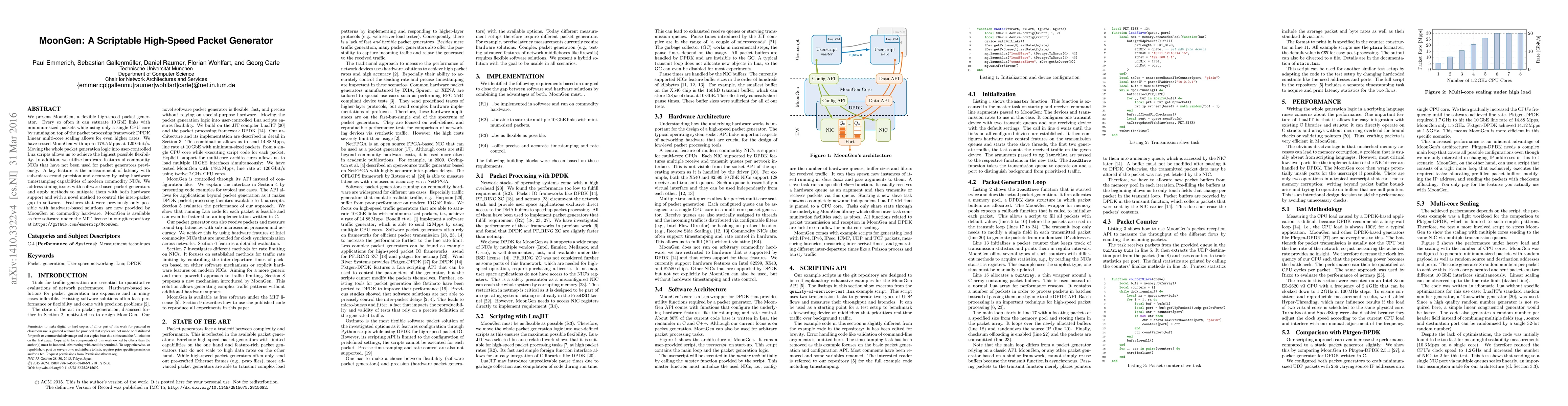 MoonGen is a high-speed packet generator that saturates 10 GbE links using a single CPU core, leveraging DPDK and Lua scripts for flexibility. It achieves up to 178.5 Mpps at 120 Gbit/s and provides sub-microsecond latency precision through hardware timestamping.