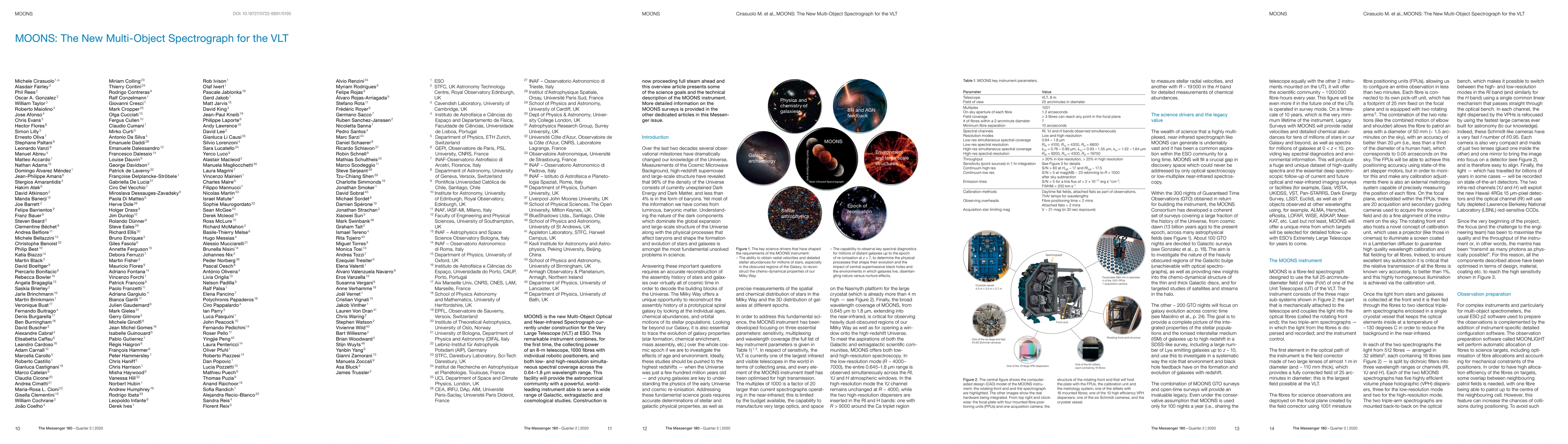 MOONS is a new multi-object spectrograph for the VLT telescope, combining 8-m telescope power with 1000 robotically positioned fibres, offering simultaneous low- and high-resolution spectral coverage. It aims to advance Galactic, extragalactic, and cosmological studies.