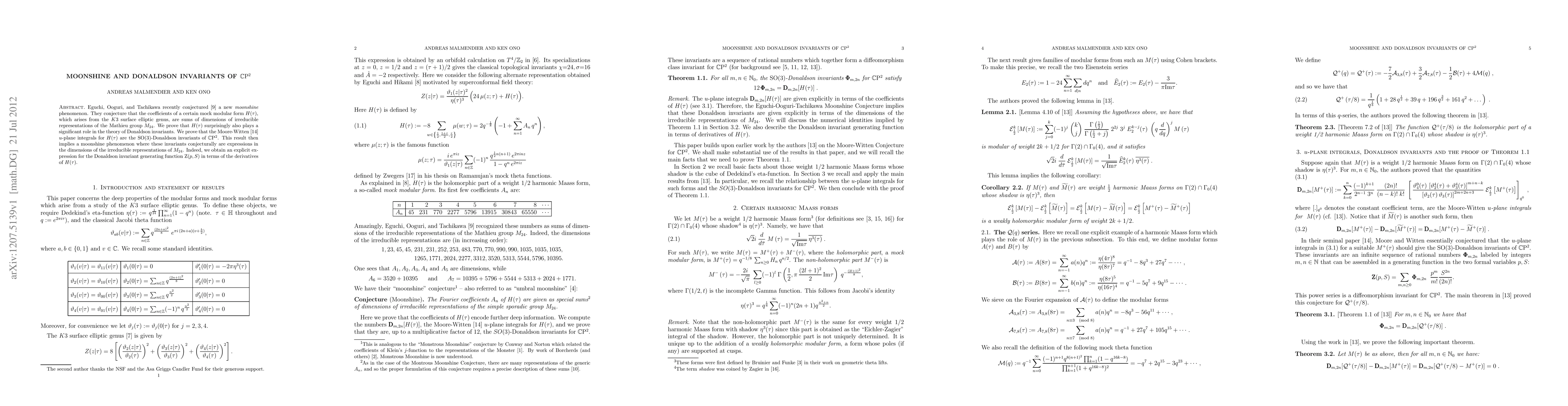 This paper proves a connection between a mock modular form H(tau) from K3 surface elliptic genus and Donaldson invariants of CP^2, showing that the u-plane integrals of H(tau) correspond to the SO(3)-Donaldson invariants. This establishes a new moonshine phenomenon linking these invariants to the dimensions of irreducible representations of the Mathieu group M24.