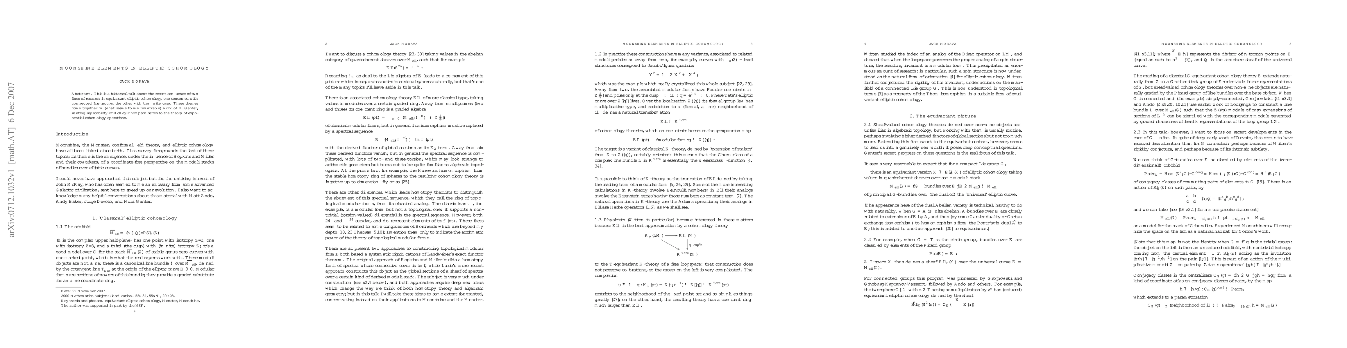 This is a historical talk about the recent confluence of two lines of research in equivariant elliptic cohomology, one concerned with connected Lie groups, the other with the finite case. These themes come together in (what seems to me remarkable) work of N. Ganter, relating replicability of McKay-Thompson series to the theory of exponential cohomology operations.