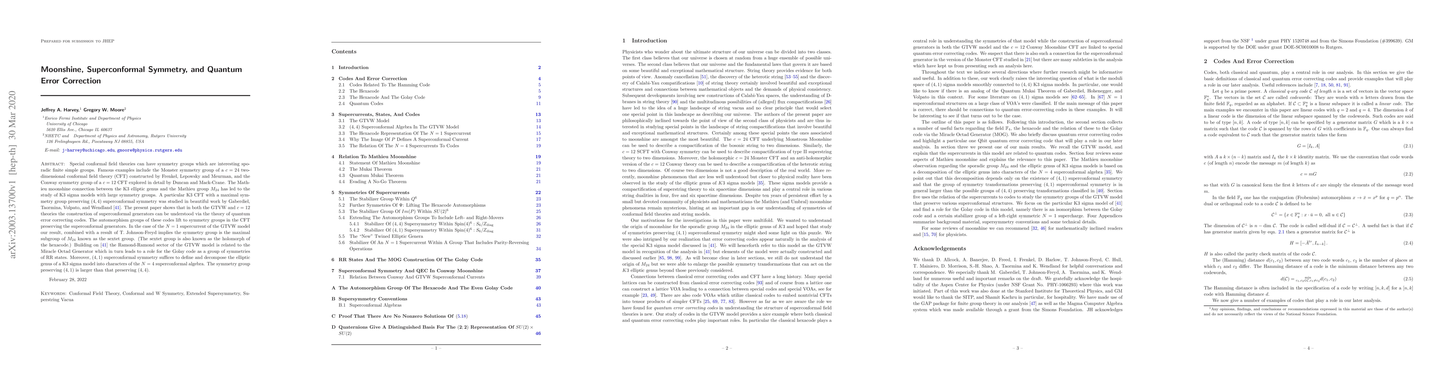 Special conformal field theories can have symmetry groups which are interesting sporadic finite simple groups. Famous examples include the Monster symmetry group of a $c=24$ two-dimensional conformal field theory (CFT) constructed by Frenkel, Lepowsky and Meurman, and the Conway symmetry group of a $c=12$ CFT explored in detail by Duncan and Mack-Crane. The Mathieu moonshine connection between the K3 elliptic genus and the Mathieu group $M_{24}$ has led to the study of K3 sigma models with large symmetry groups. A particular K3 CFT with a maximal symmetry group preserving $(4,4)$ superconformal symmetry was studied in beautiful work by Gaberdiel, Taormina, Volpato, and Wendland. The present paper shows that in both the GTVW and $c=12$ theories the construction of superconformal generators can be understood via the theory of quantum error correcting codes. The automorphism groups of these codes lift to symmetry groups in the CFT preserving the superconformal generators. In the case of the $N=1$ supercurrent of the GTVW model our result, combined with a result of T. Johnson-Freyd implies the symmetry group is the maximal subgroup of $M_{24}$ known as the sextet group. (The sextet group is also known as the holomorph of the hexacode.) Building on \cite{gtvw} the Ramond-Ramond sector of the GTVW model is related to the Miracle Octad Generator which in turn leads to a role for the Golay code as a group of symmetries of RR states. Moreover, $(4,1)$ superconformal symmetry suffices to define and decompose the elliptic genus of a K3 sigma model into characters of the $N=4$ superconformal algebra. The symmetry group preserving $(4,1)$ is larger than that preserving $(4,4)$.
