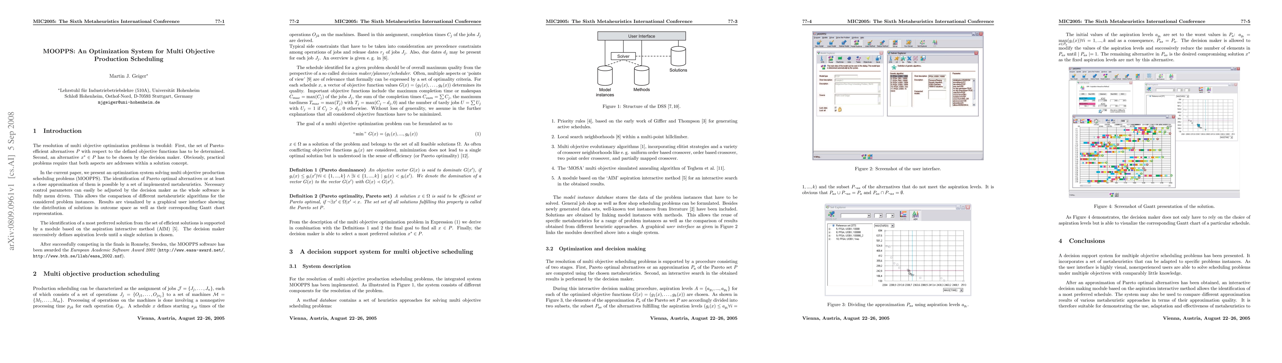 The paper introduces MOOPPS, an optimization system for multi-objective production scheduling problems. It uses metaheuristics with adjustable parameters for solution identification, and a graphical interface for visualization. A module based on the aspiration interactive method (AIM) helps decision-makers choose a preferred solution from Pareto-optimal alternatives, with MOOPPS winning the European Academic Software Award 2002.