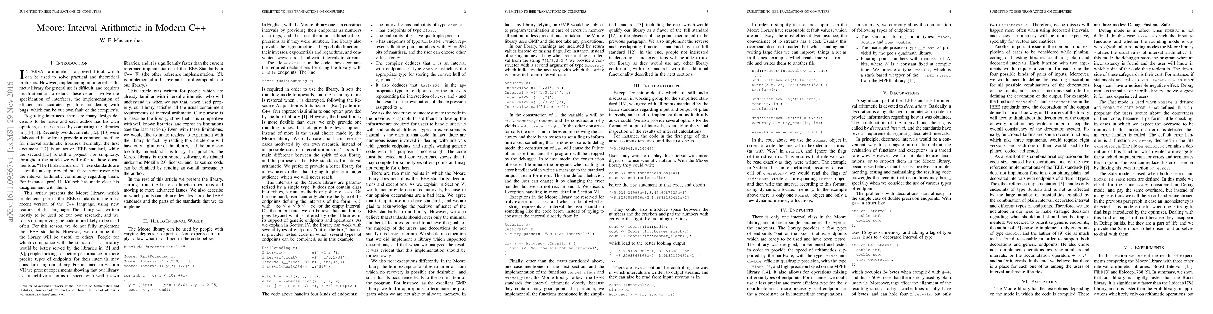 Summary: The paper introduces Moore, a C++ library for interval arithmetic utilizing modern C++ concepts, which simplifies template metaprogramming and offers a novel approach to implementing interval arithmetic.