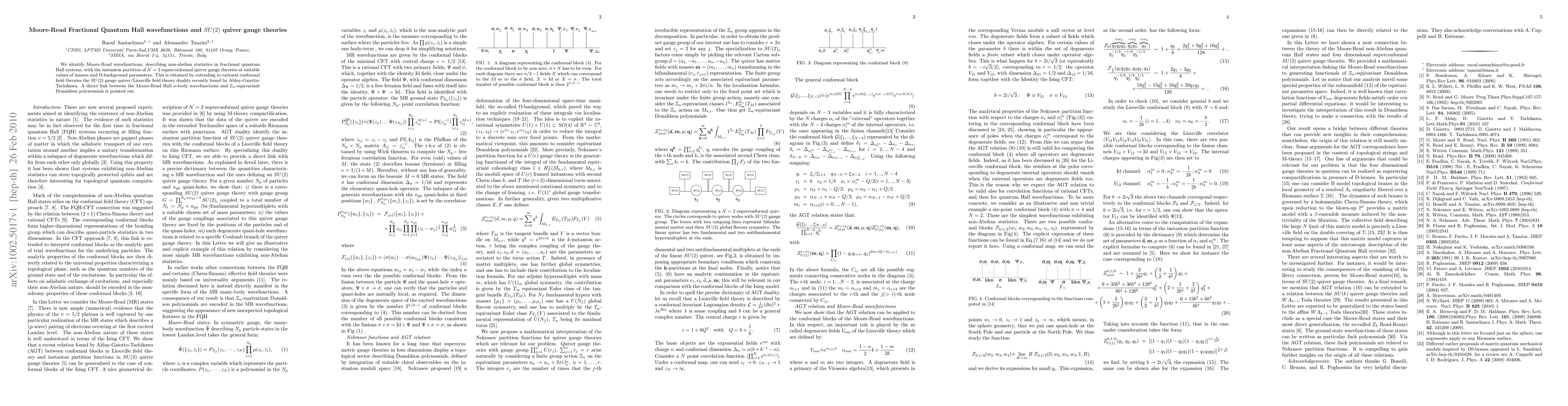 Summary: The paper connects Moore-Read wavefunctions in fractional quantum Hall systems to instanton partitions in N=2 superconformal quiver gauge theories, leveraging an extended SU(2) gauge quiver/Liouville duality, and establishes a link to Z_n-equivariant Donaldson polynomials.