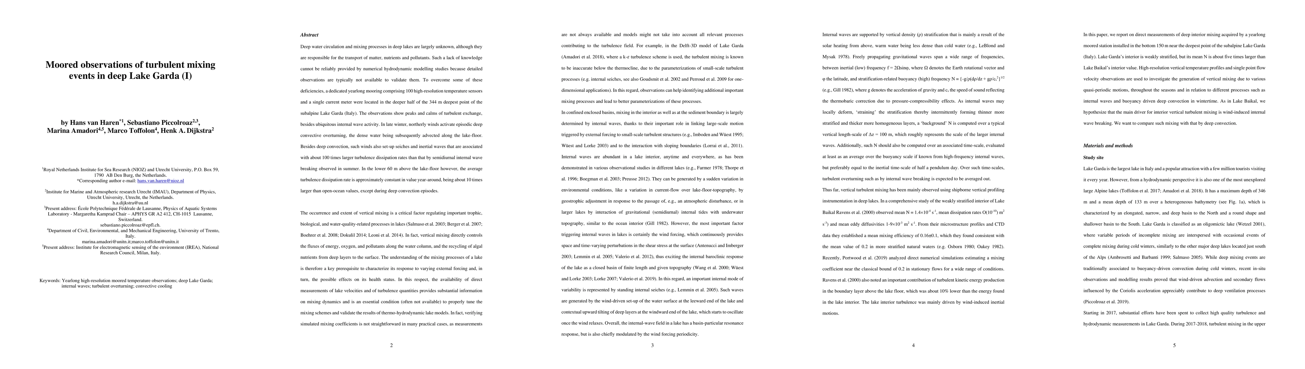 Researchers deployed a mooring in Lake Garda to study turbulent mixing events, finding that northerly winds trigger deep convection and seiches, leading to high turbulence dissipation rates. The study highlights the importance of direct observations in understanding lake circulation and mixing processes.