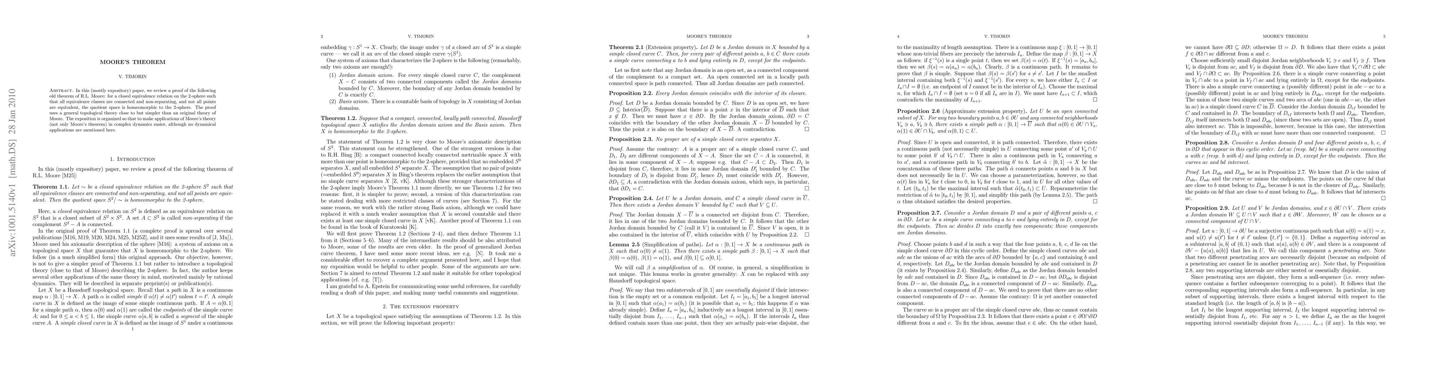 Moore's theorem states that a closed equivalence relation on the 2-sphere with connected, non-separating equivalence classes and non-trivial relations results in a quotient space that is homeomorphic to the 2-sphere. The paper provides a simplified proof using a general topological theory, aiming to facilitate applications in complex dynamics.