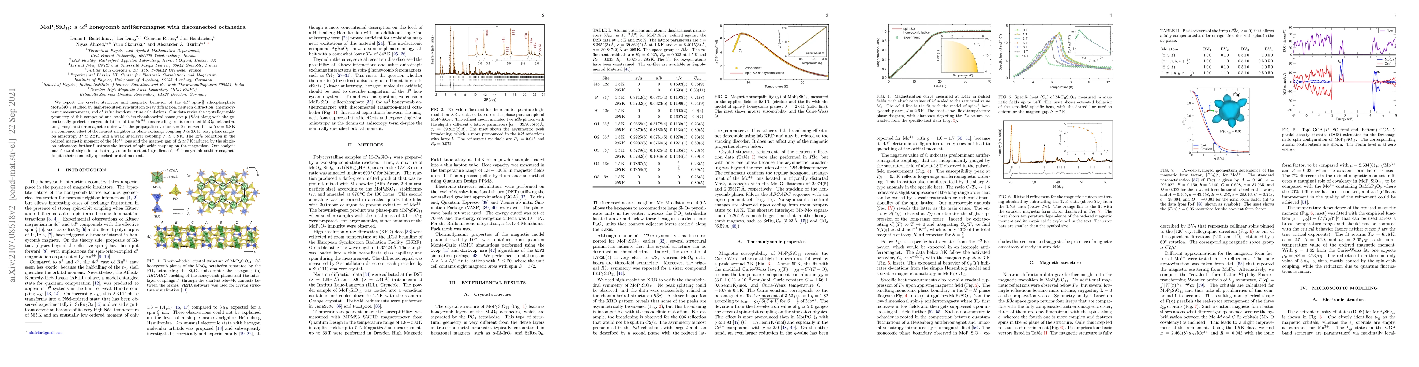 We report the crystal structure and magnetic behavior of the $4d^3$ spin-$\frac32$ silicophosphate MoP$_3$SiO$_{11}$ studied by high-resolution synchrotron x-ray diffraction, neutron diffraction, thermodynamic measurements, and ab initio band-structure calculations. Our data revise the crystallographic symmetry of this compound and establish its rhombohedral space group ($R\bar 3c$) along with the geometrically perfect honeycomb lattice of the Mo$^{3+}$ ions residing in disconnected MoO$_6$ octahedra. Long-range antiferromagnetic order with the propagation vector $\mathbf k=0$ observed below $T_N=6.8$ K is a combined effect of the nearest-neighbor in-plane exchange coupling $J\simeq 2.6$ K, easy-plane single-ion anisotropy $D\simeq 2.2 $ K, and a weak interlayer coupling $J_c\simeq 0.8$ K. The 12% reduction in the ordered magnetic moment of the Mo$^{3+}$ ions and the magnon gap of $\Delta\simeq 7$ K induced by the single-ion anisotropy further illustrate the impact of spin-orbit coupling on the magnetism. Our analysis puts forward single-ion anisotropy as an important ingredient of $4d^3$ honeycomb antiferromagnets despite their nominally quenched orbital moment.