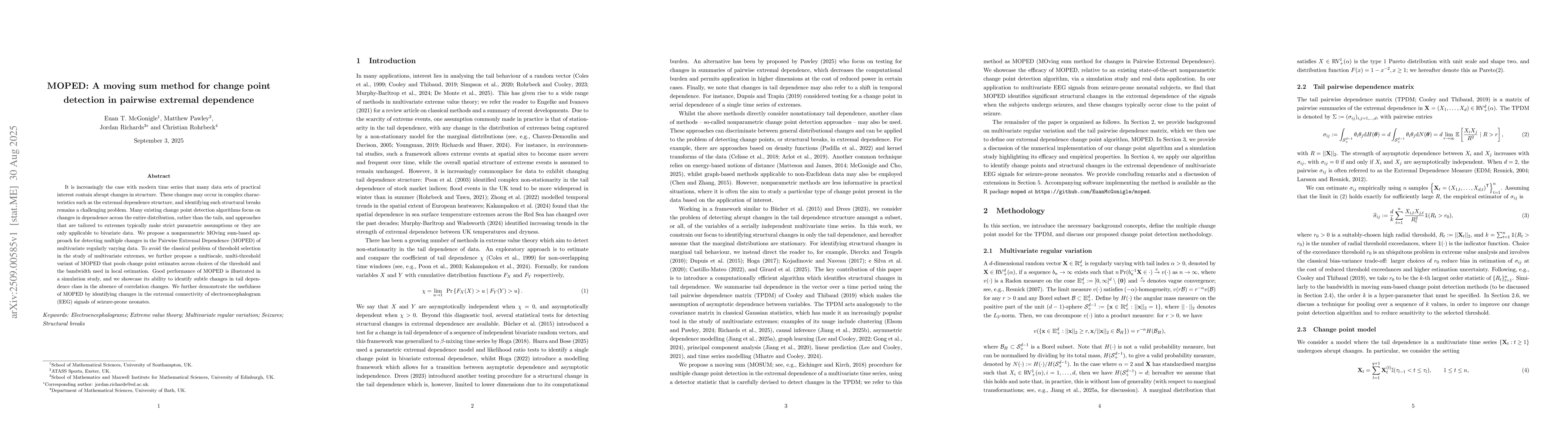 It is increasingly the case with modern time series that many data sets of practical interest contain abrupt changes in structure. These changes may occur in complex characteristics such as the extremal dependence structure, and identifying such structural breaks remains a challenging problem. Many existing change point detection algorithms focus on changes in dependence across the entire distribution, rather than the tails, and approaches that are tailored to extremes typically make strict parametric assumptions or they are only applicable to bivariate data. We propose a nonparametric MOving sum-based approach for detecting multiple changes in the Pairwise Extremal Dependence (MOPED) of multivariate regularly varying data. To avoid the classical problem of threshold selection in the study of multivariate extremes, we further propose a multiscale, multi-threshold variant of MOPED that pools change point estimates across choices of the threshold and the bandwidth used in local estimation. Good performance of MOPED is illustrated in a simulation study, and we showcase its ability to identify subtle changes in tail dependence class in the absence of correlation changes. We further demonstrate the usefulness of MOPED by identifying changes in the extremal connectivity of electroencephalogram (EEG) signals of seizure-prone neonates.