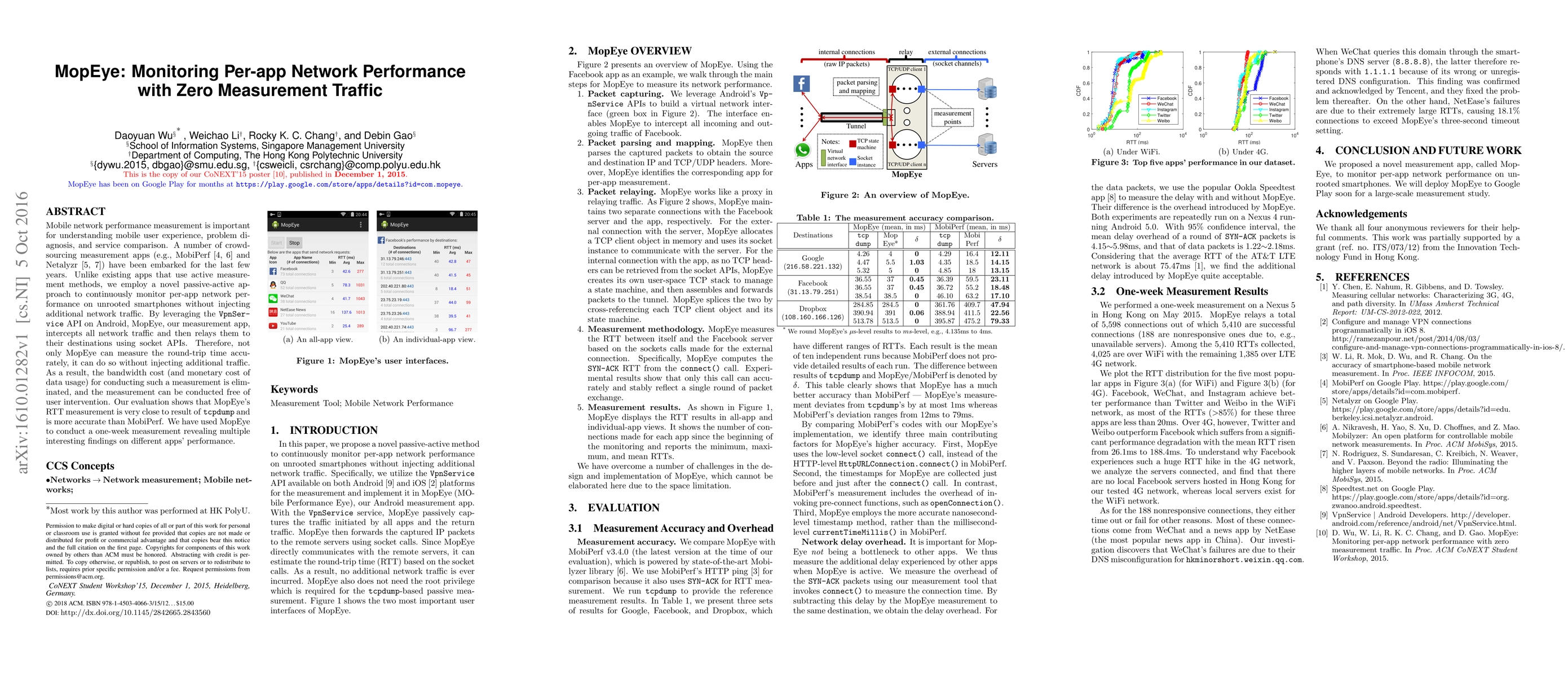 MopEye employs a novel passive-active approach to monitor per-app network performance on unrooted smartphones without additional measurement traffic, leveraging Android's VpnService API. Evaluations show MopEye's RTT measurements are accurate and more precise than existing apps, revealing insights into app performance over a week.