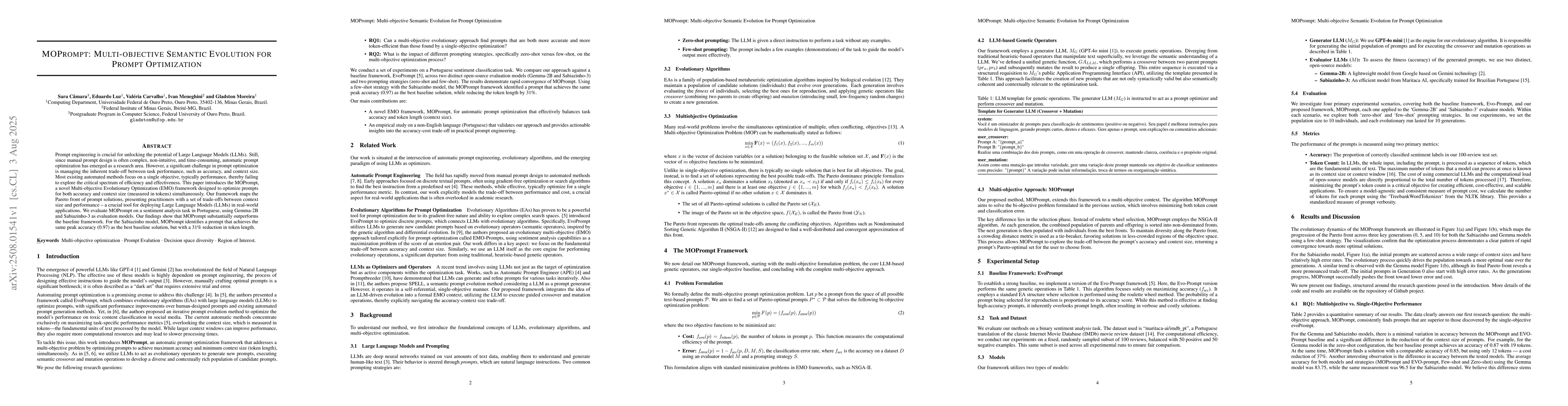 Prompt engineering is crucial for unlocking the potential of Large Language Models (LLMs). Still, since manual prompt design is often complex, non-intuitive, and time-consuming, automatic prompt optimization has emerged as a research area. However, a significant challenge in prompt optimization is managing the inherent trade-off between task performance, such as accuracy, and context size. Most existing automated methods focus on a single objective, typically performance, thereby failing to explore the critical spectrum of efficiency and effectiveness. This paper introduces the MOPrompt, a novel Multi-objective Evolutionary Optimization (EMO) framework designed to optimize prompts for both accuracy and context size (measured in tokens) simultaneously. Our framework maps the Pareto front of prompt solutions, presenting practitioners with a set of trade-offs between context size and performance, a crucial tool for deploying Large Language Models (LLMs) in real-world applications. We evaluate MOPrompt on a sentiment analysis task in Portuguese, using Gemma-2B and Sabiazinho-3 as evaluation models. Our findings show that MOPrompt substantially outperforms the baseline framework. For the Sabiazinho model, MOPrompt identifies a prompt that achieves the same peak accuracy (0.97) as the best baseline solution, but with a 31% reduction in token length.