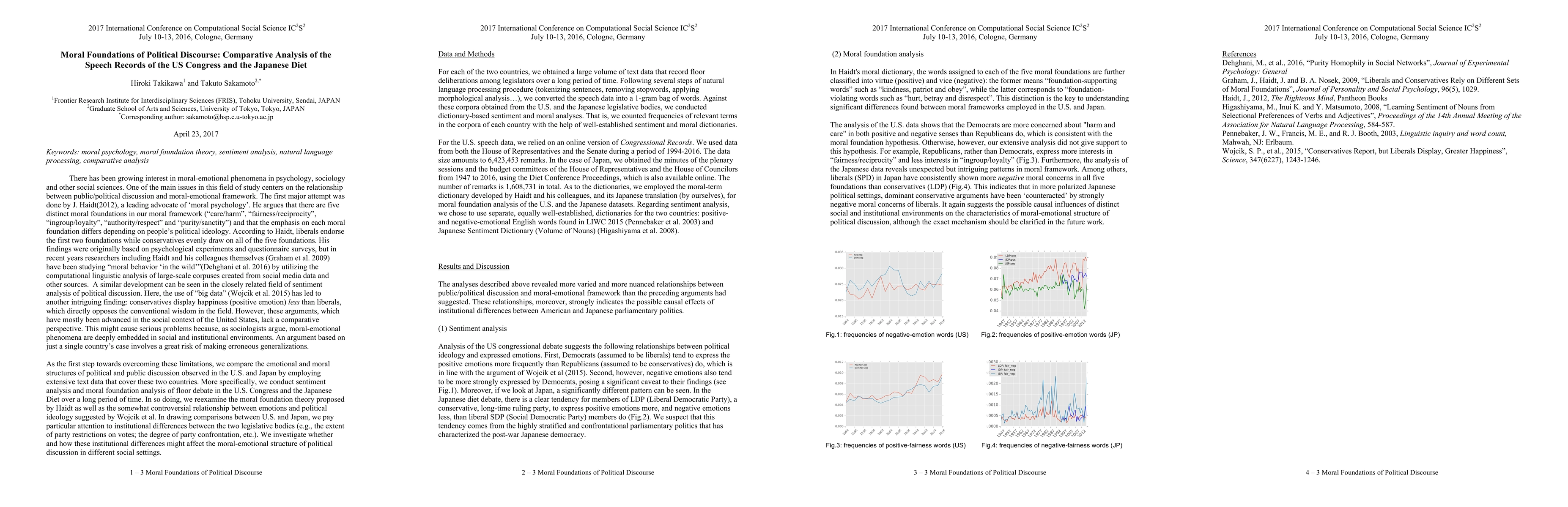 This study compares moral-emotional foundations in U.S. Congress and Japanese Diet speeches, challenging existing theories like Haidt's moral foundation hypothesis, using extensive text data and sentiment/moral analyses over time.