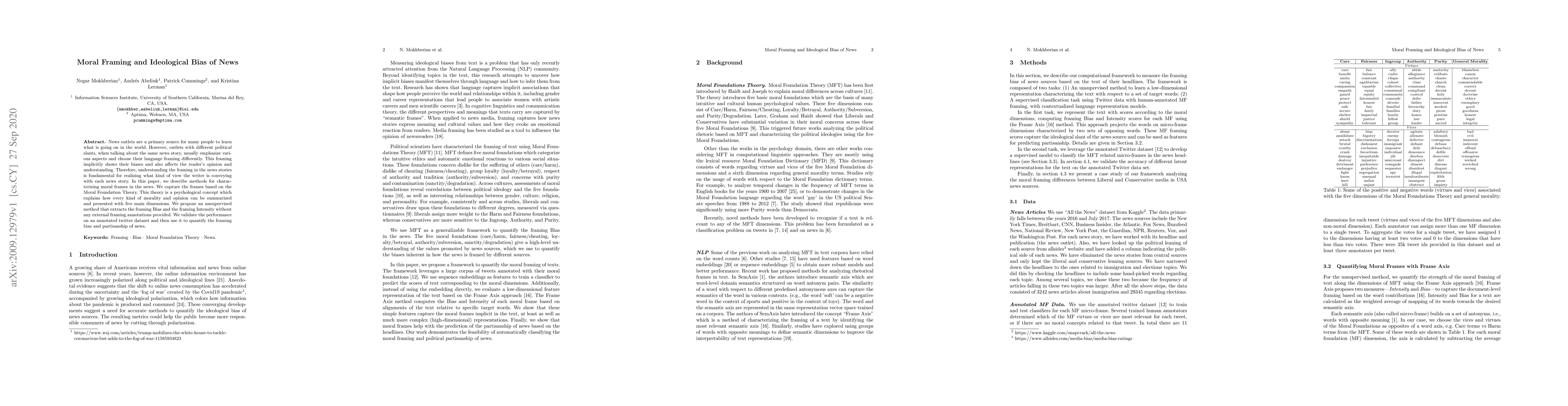 This paper proposes an unsupervised method to characterize moral framing in news stories based on Moral Foundation Theory, aiming to quantify the ideological bias and framing intensity without external annotations. It validates the method on a Twitter dataset and applies it to analyze the framing bias and partisanship in news outlets.