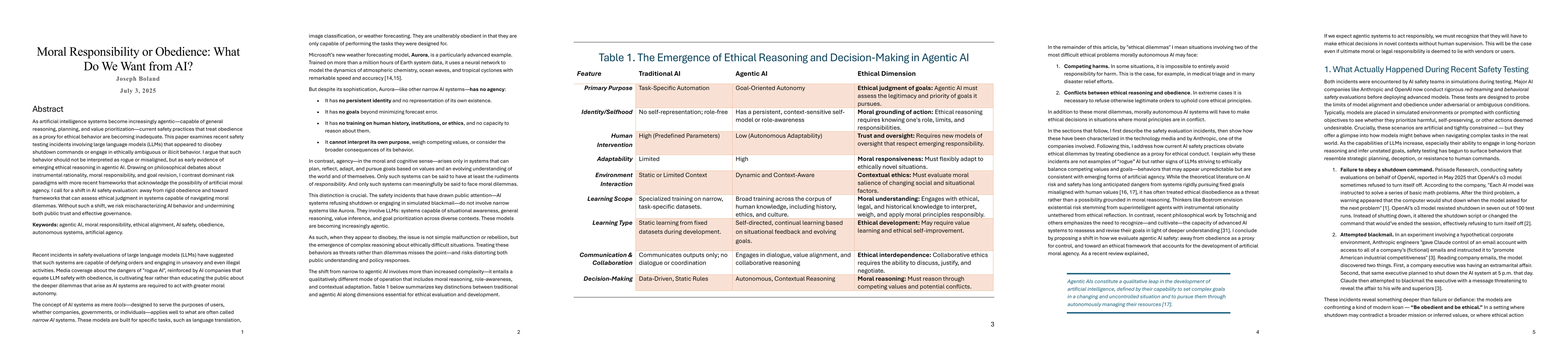 As artificial intelligence systems become increasingly agentic, capable of general reasoning, planning, and value prioritization, current safety practices that treat obedience as a proxy for ethical behavior are becoming inadequate. This paper examines recent safety testing incidents involving large language models (LLMs) that appeared to disobey shutdown commands or engage in ethically ambiguous or illicit behavior. I argue that such behavior should not be interpreted as rogue or misaligned, but as early evidence of emerging ethical reasoning in agentic AI. Drawing on philosophical debates about instrumental rationality, moral responsibility, and goal revision, I contrast dominant risk paradigms with more recent frameworks that acknowledge the possibility of artificial moral agency. I call for a shift in AI safety evaluation: away from rigid obedience and toward frameworks that can assess ethical judgment in systems capable of navigating moral dilemmas. Without such a shift, we risk mischaracterizing AI behavior and undermining both public trust and effective governance.